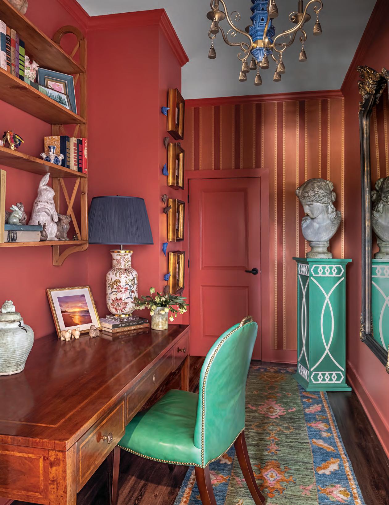 The look is bold and dramatic, starting from the entryway. Inspired by a vignette the client had seen in Bergdorf Goodman, Phillips drenched the foyer in a saturated coral for maximum effect. A niche just inside the front door serves a home office. While the placement might be a tad unconventional, it works perfectly in this setting, making practical use of the onebedroom unit’s somewhat limited space. Practical and fabulous, that is. The Italianinspired writing desk is punched up by a green leather chair with nailhead trim. The designer repeated the juicy hue on an embellished pedestal from Chelsea House.