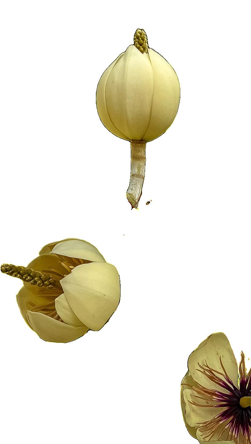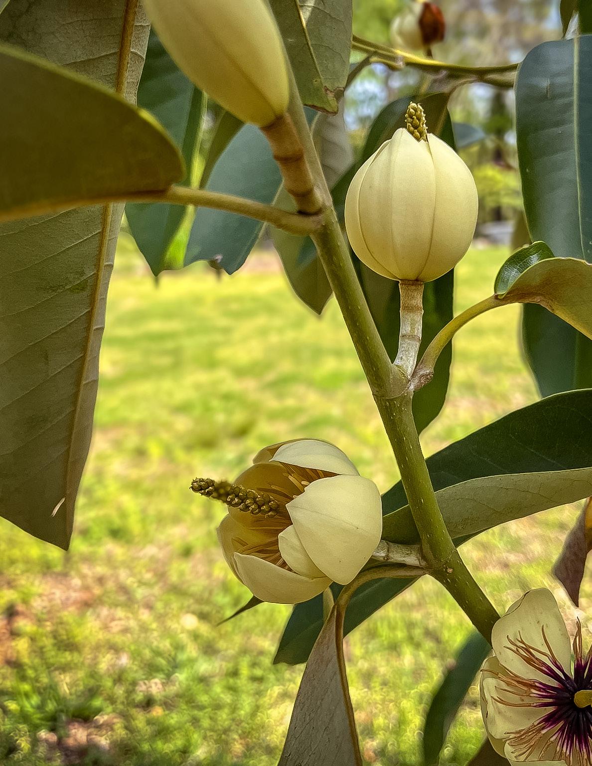 Magnolia foveolata, an outstanding member of the Garden’s magnolia collection, is an evergreen species featuring large creamy white-yellow flowers in spring. Native to Vietnam and southern China, this species can be found along the Camellia Walk and exhibits golden new growth each year.