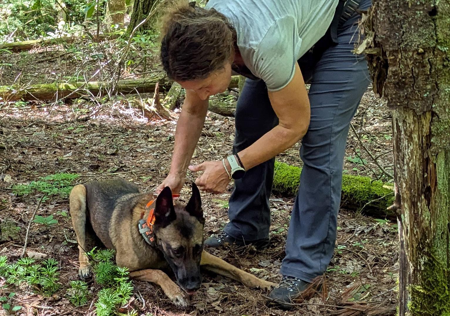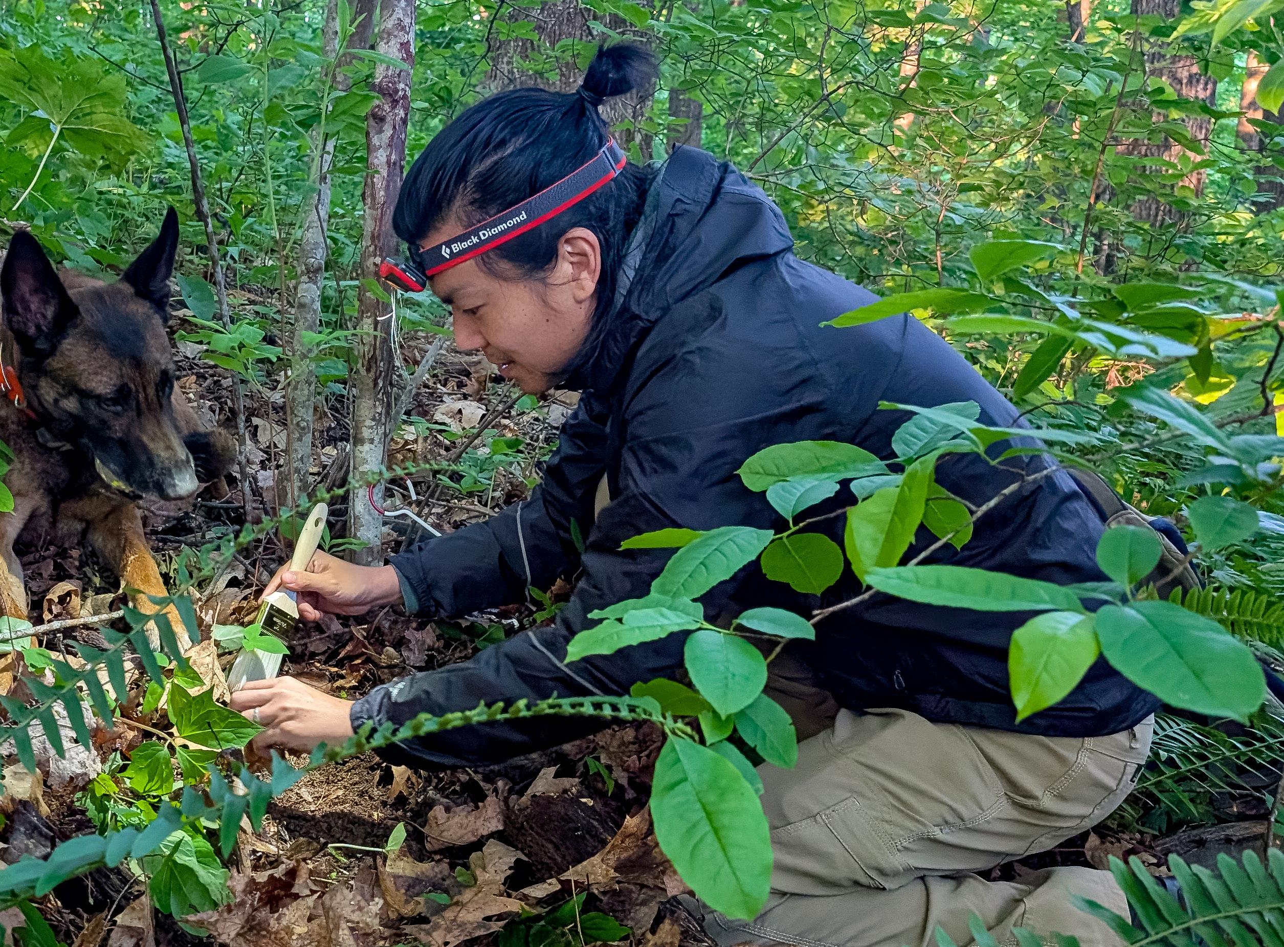 Through the cool mountain mist, DJ, a Belgian Malinois, moves with purpose, nose to the ground and paws whispering over the leaf litter. His trainer, Missouri biologist Karen DeMatteo, PhD, follows close behind, watching for his signal — a sudden heel, a prod with his snout, a hopeful glance and a wag of the tail.
