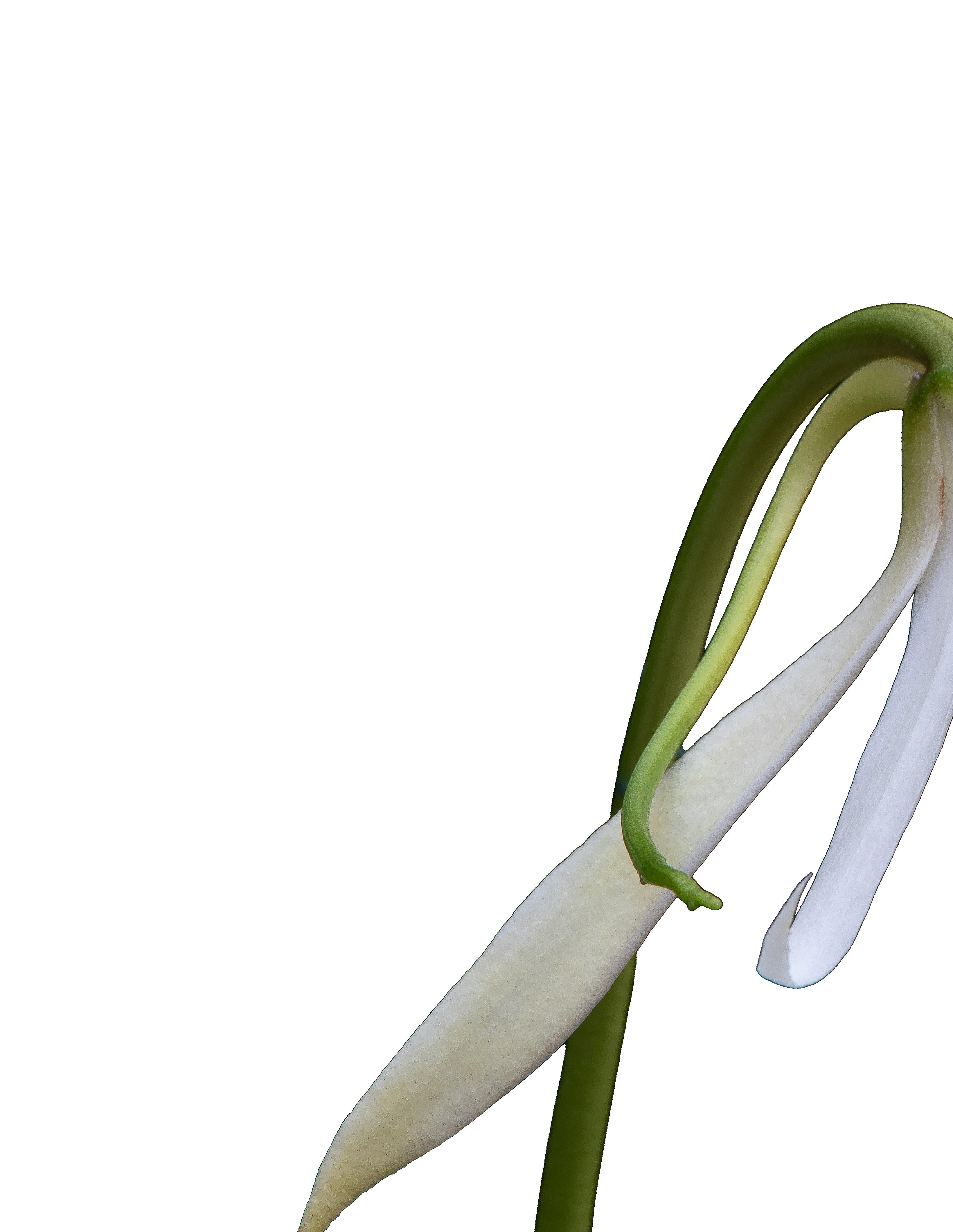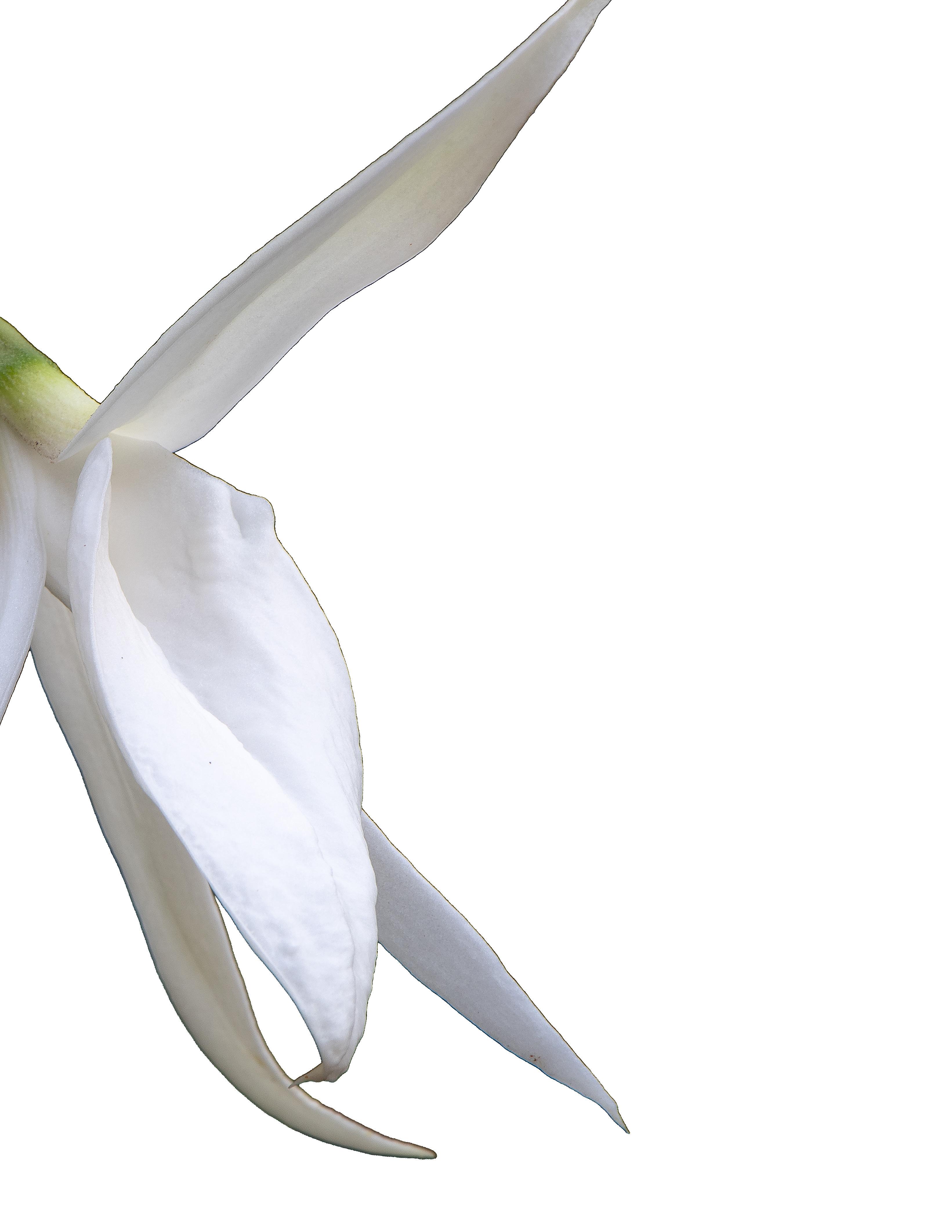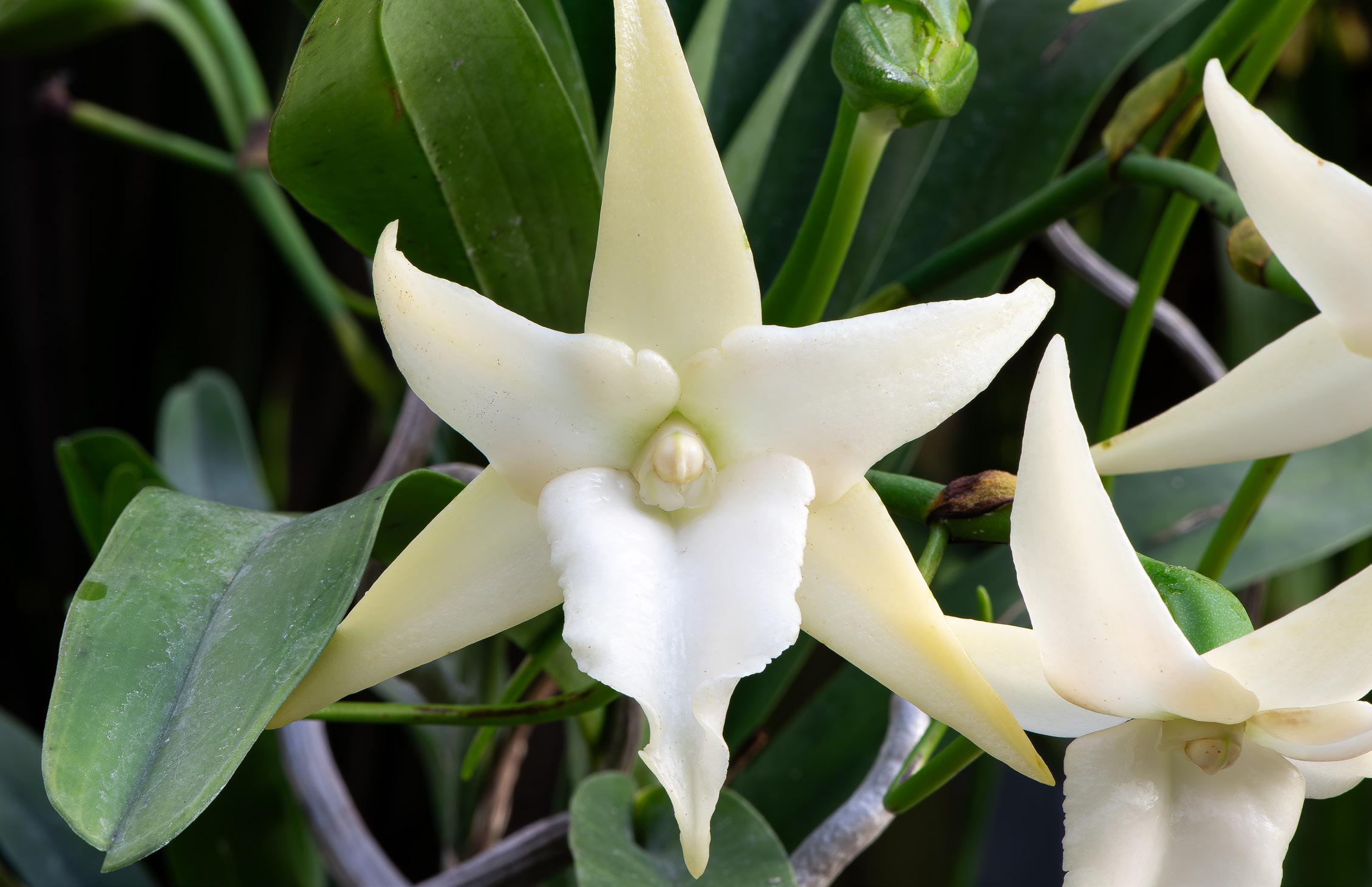 Many of the epiphytic orchid species that are common in cultivation come from about 5,000 to 6,500 feet in the mid- to upper elevations of the eastern rainforest and want cool to intermediate growing conditions. These are grown in the Garden’s intermediate greenhouse, next to the wet wall, mounted on cork and placed vertically at the height where they receive the appropriate amount of light. Species from warm lowland areas that enjoy bright light, such as the striking eburneum ssp. superbum and A. longicalar, are grown in a greenhouse with a 64-degree night minimum and 50 percent shade. Species that want warm temperatures and deep shade, like several species of Aerangis, are grown in a warm greenhouse with 80 percent shade and 85 percent humidity.