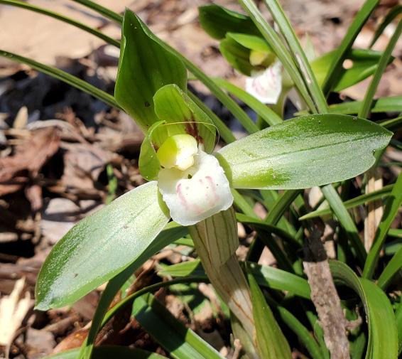 Cymbidium goeringii, and its cultivars are members of the Garden’s growing collection of hardy orchids, predominately in Storza Woods accompanying many of the native azaleas. Fragrant green flowers splashed with red spots take years to mature and begin to bloom before winter is over.