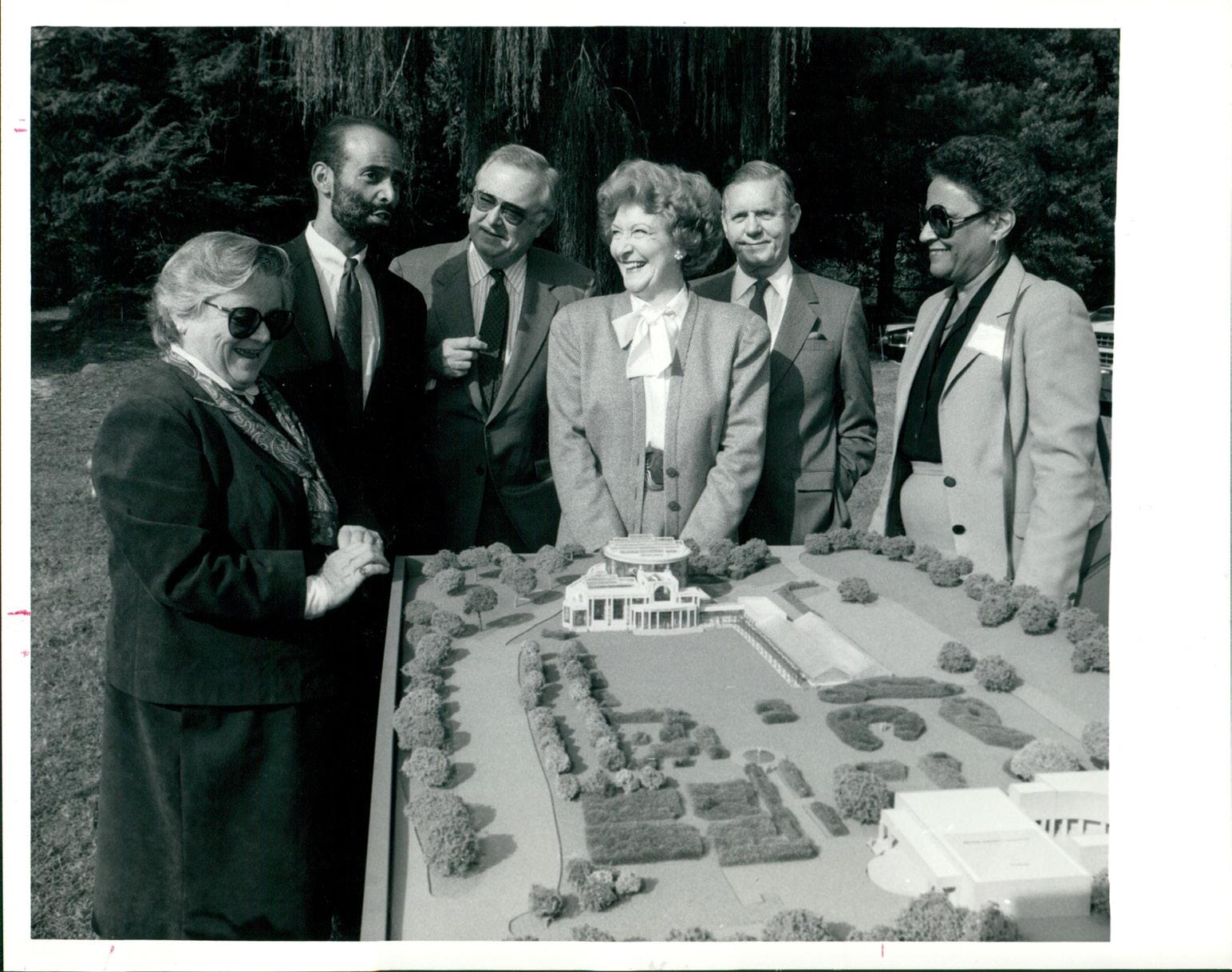 Garden Executive Director, Ann Crammond (left) and Dorothy (center) and J.B. Fuqua (center right) unveil a model of the proposed Fuqua Conservatory.