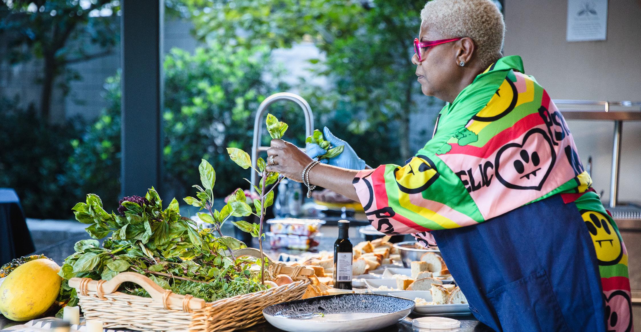 Chef Deborah VanTrece gives a demonstration in the Edible Garden Outdoor Kitchen.