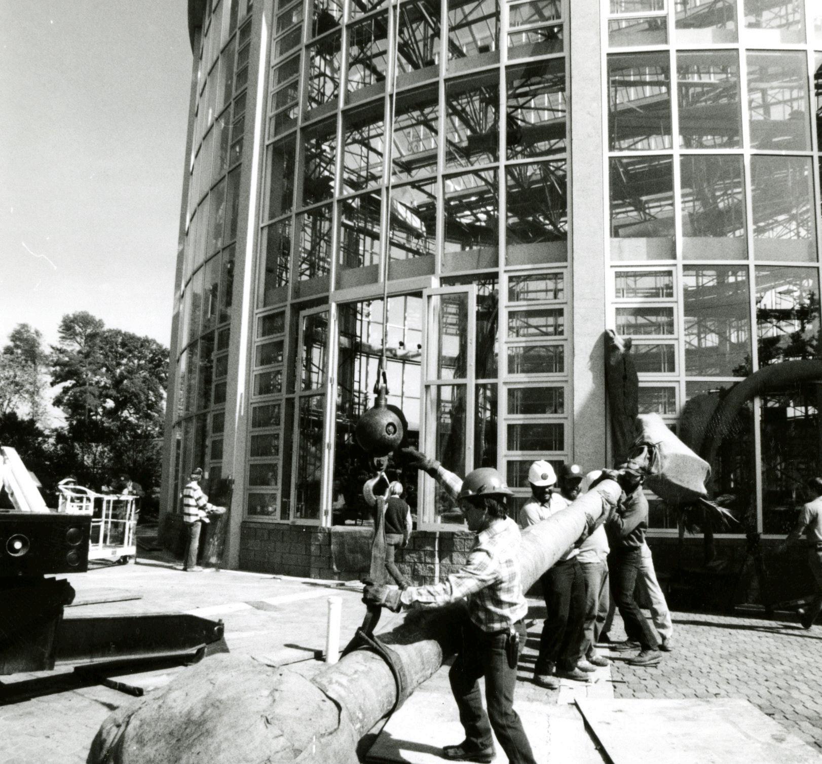 A towering Spindle Palm is installed in the new Fuqua Conservatory. Copyright The Atlanta Journal-Constitution Courtesy of Special Collections and Archives, Georgia State University Library.