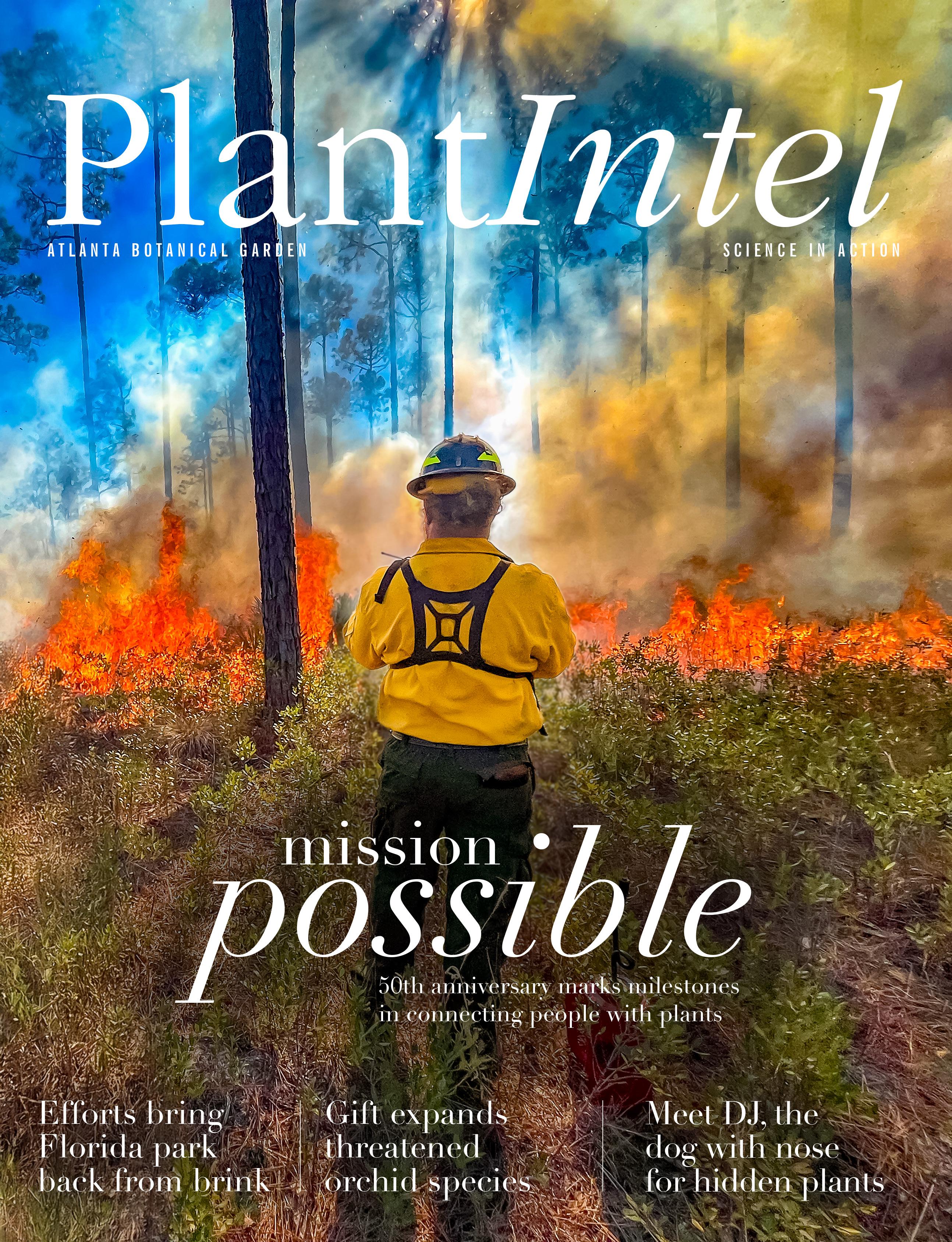 And the work continues at an unprecedented pace, as this eighth annual issue of PlantIntel illustrates. Go behind the scenes with our conservationists in the Panhandle as they mark success after 10 years of efforts to restore 300 acres of imperiled wetlands. Learn about one of the Garden’s most fascinating but lesser-known orchid collections that is growing at a time when its species is threatened with extinction. Get to know the various ways the Garden’s dedicated volunteers engage guests in teaching moments — in many ways, just as they have done since the Garden’s founding. And meet DJ, the nosy canine conservationist lending a paw to staff as they strive to sniff out rare and, in many cases, threatened plants.