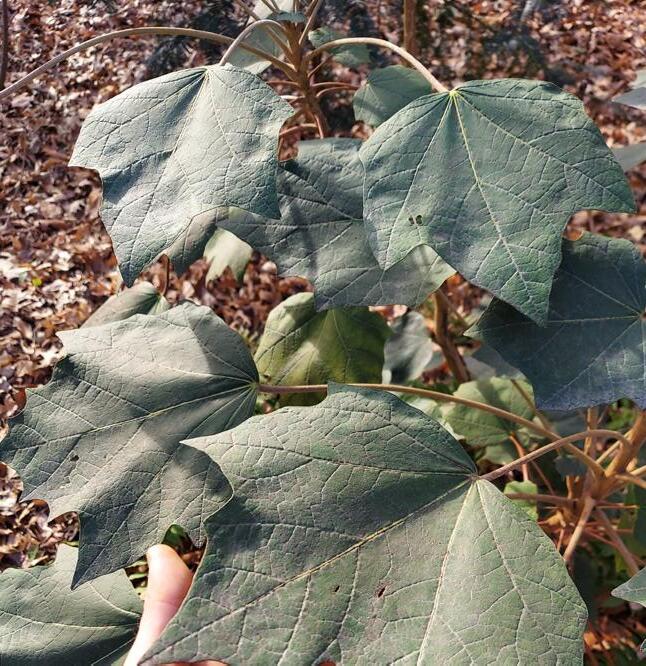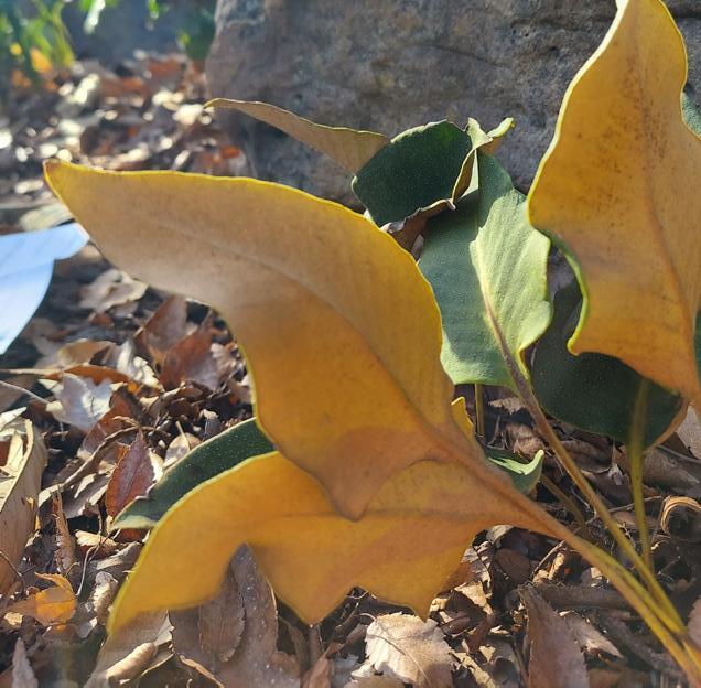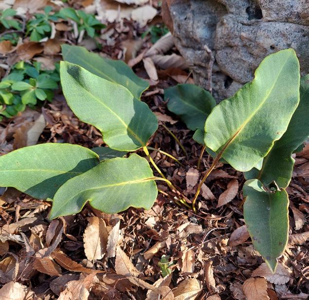 ▼ Felt ferns, Pyrrosia drakeana, have a native range from northeast India to Southeast China, often growing at high elevations along the Himalayan Mountains. One of the cold hardiest tongue ferns, this species remains evergreen at the Garden. Slow-growing rhizomes produce single-bladed fronds with a soft texture reminiscent of felt. The back of each leaf features a striking gold or coppery contrast to its blue-green leaf face. Its unusual composure graces the Japanese Garden.