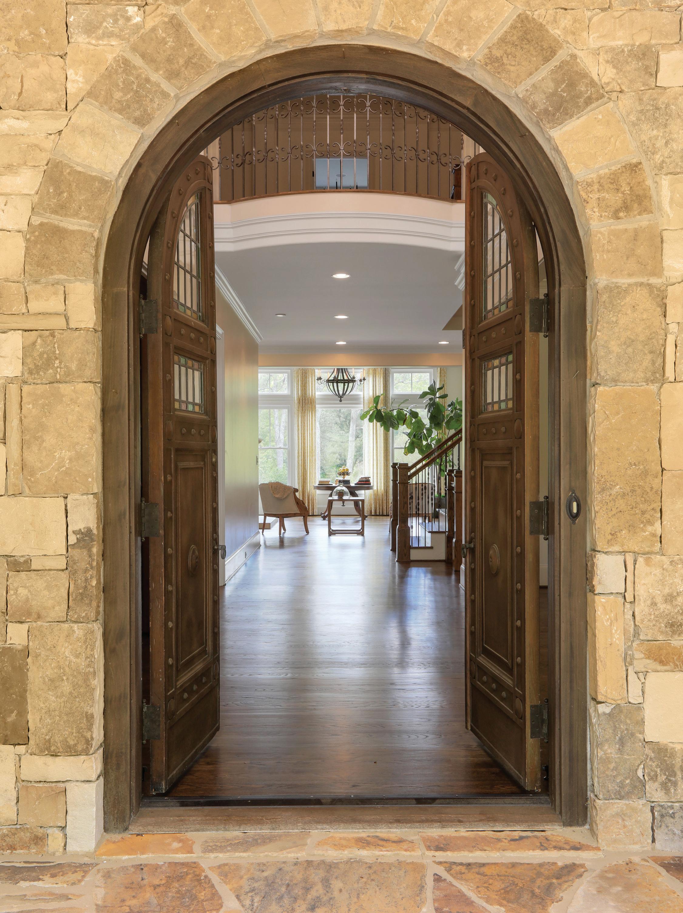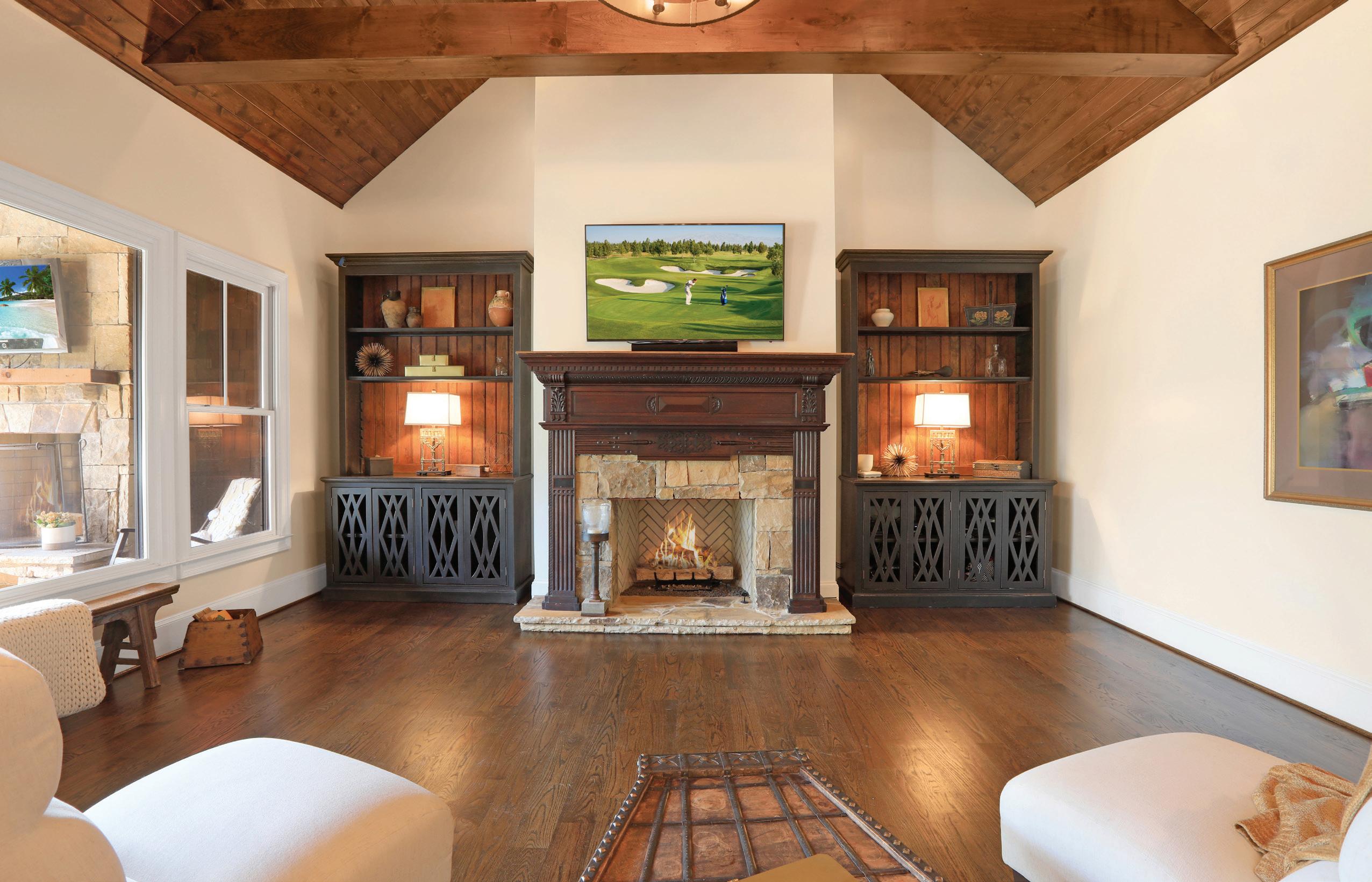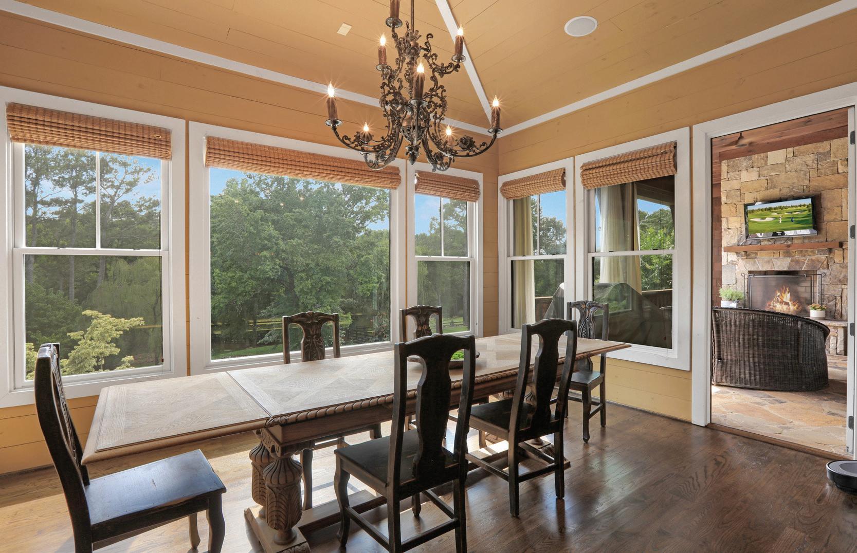 The gourmet kitchen is a culinary dream, boasting bespoke handcrafted cabinetry, a vast island, dual Sub-Zero refrigerators, three Wolf ovens and a butler’s pantry. Adjacent to this culinary haven, the breakfast room, with seating for twelve, opens to a covered porch overlooking the lush backyard, providing a serene space for relaxation.