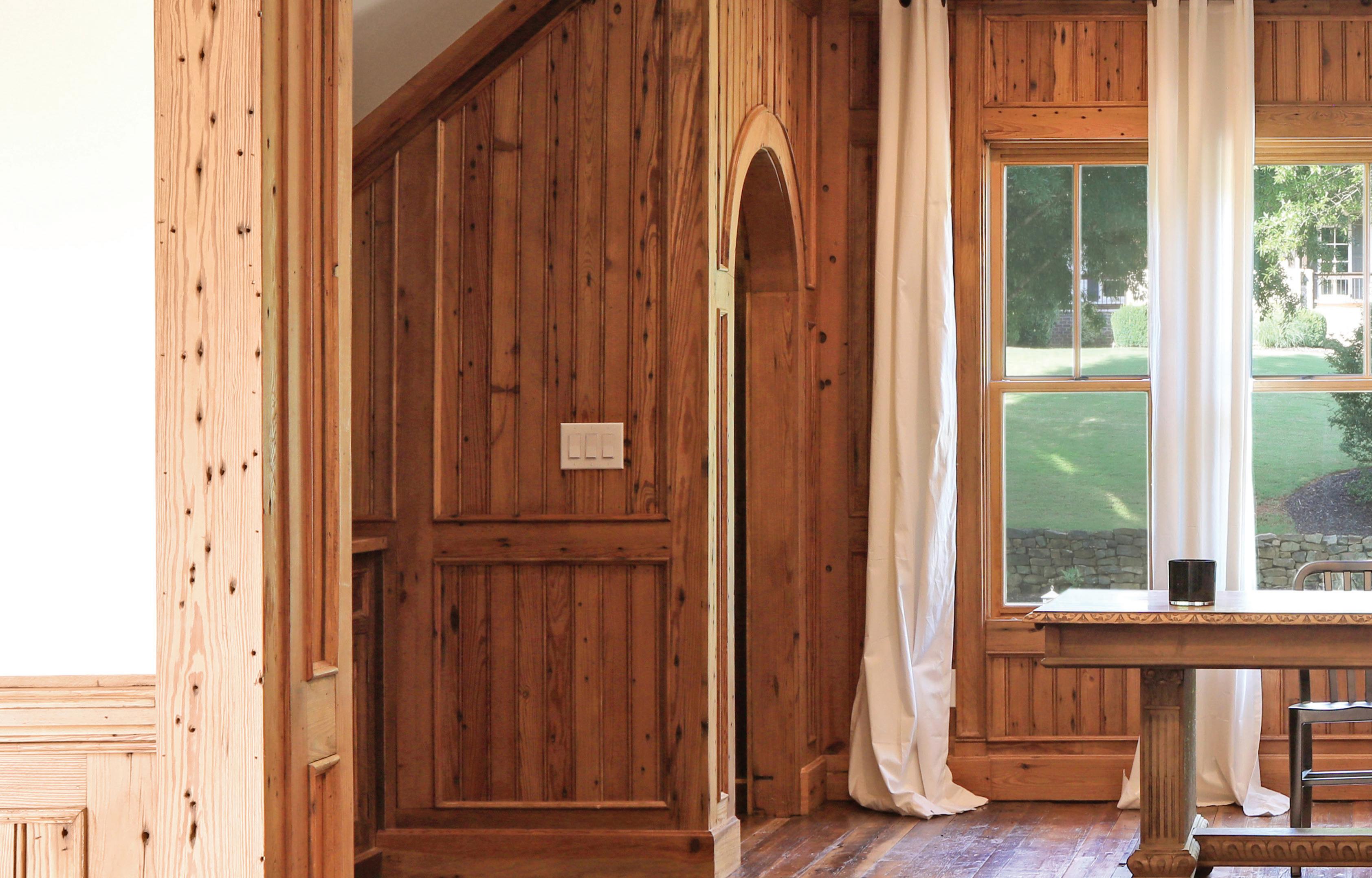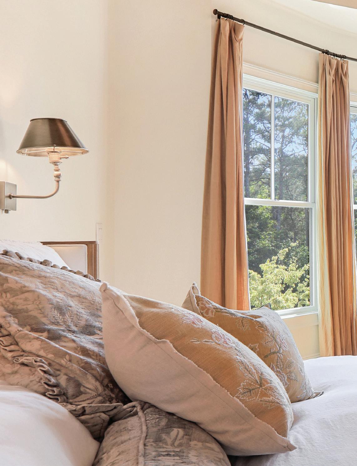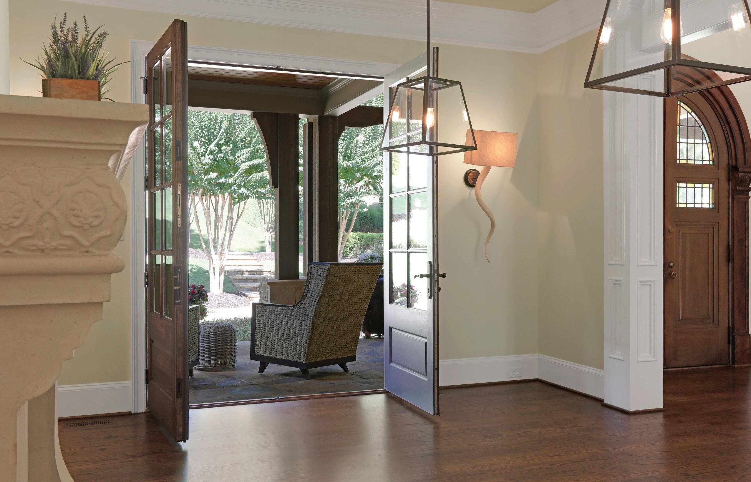 The gourmet kitchen is a culinary dream, boasting bespoke handcrafted cabinetry, a vast island, dual Sub-Zero refrigerators, three Wolf ovens and a butler’s pantry. Adjacent to this culinary haven, the breakfast room, with seating for twelve, opens to a covered porch overlooking the lush backyard, providing a serene space for relaxation.