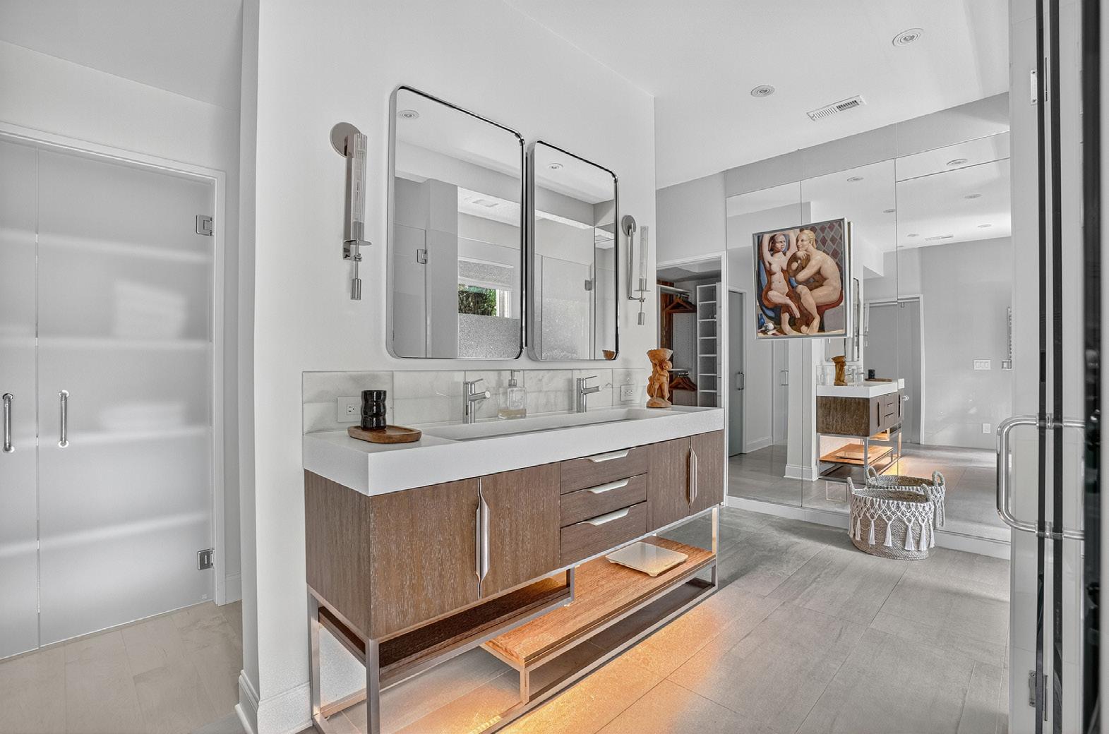 The main-level primary suite begins with a sun-drenched sitting area framed by two walls of floor-to-ceiling windows, evoking the feeling of a treehouse. A dual-sided stone fireplace connects the sitting area and bedroom, while the spa-inspired bathroom features opaque glass doors, a zero-entry shower, dual vanity, a spacious custom closet and a French door to the private outdoor spa patio.