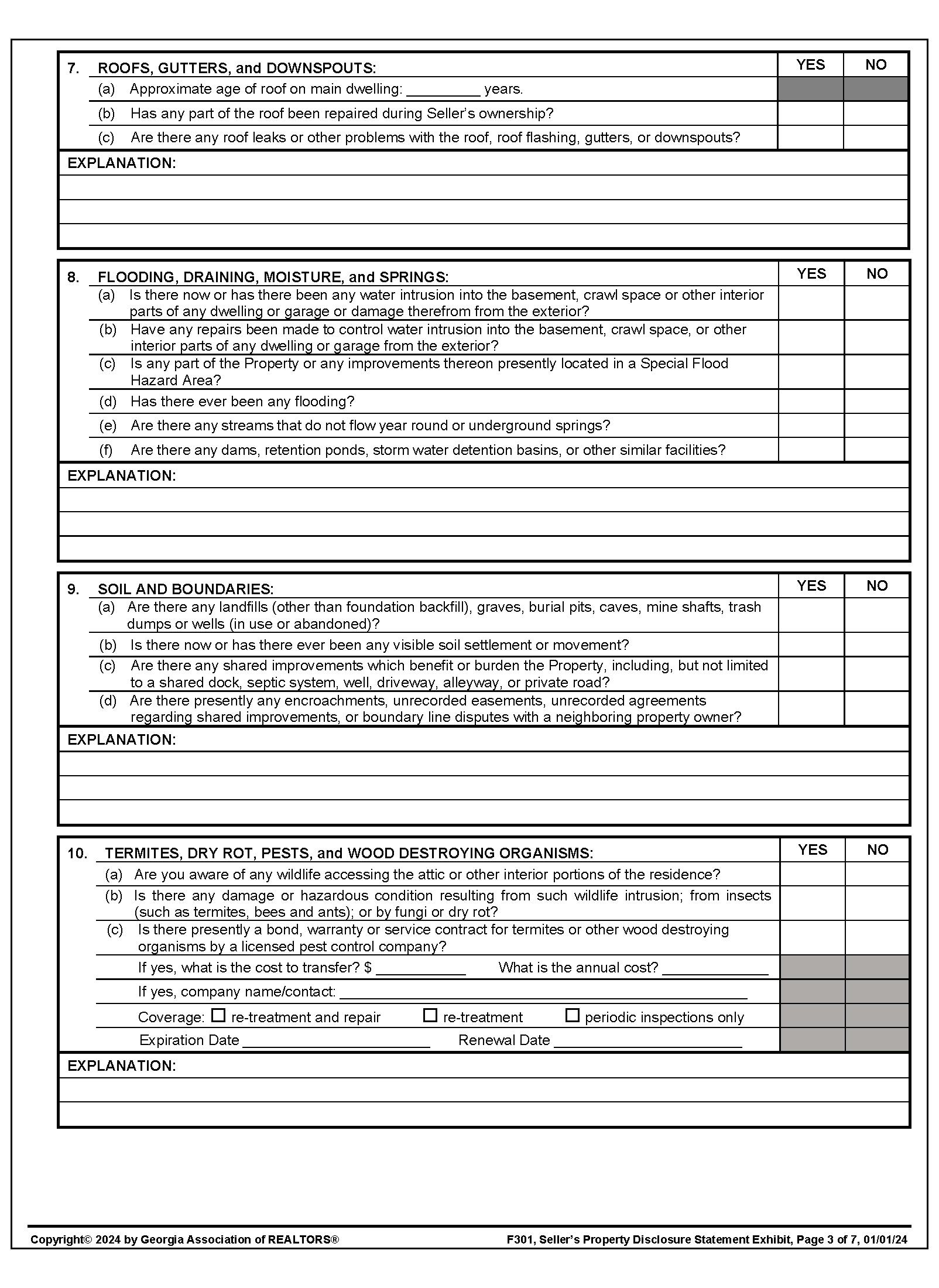 The Georgia Association of REALTORS® developed a unique tool to help a seller disclose defects in the property. It is a list of questions relative to the physical condition of the seller’s property called the Seller’s Property Disclosure Statement. The GAR contract provides that this form becomes a part of the sales contract and assumes that the buyer will see this list before making an offer on that particular property.