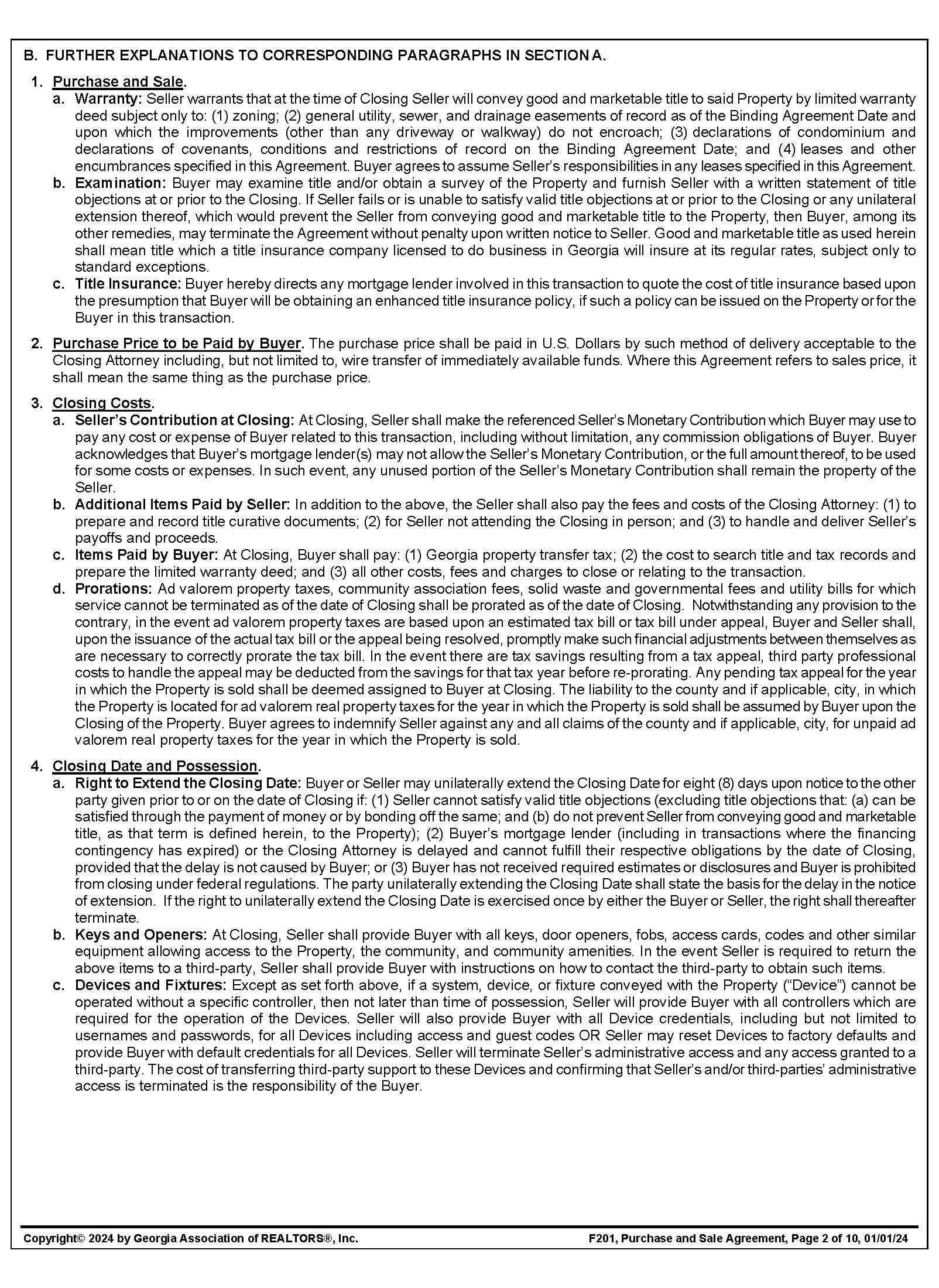 PURCHASE AND SALE AGREEMENT: The document that creates a valid, enforceable contract between a buyer and seller in Georgia is called a Purchase and Sale Agreement. This contract has been created and pre-approved by attorneys and the Georgia Association of REALTORS® (GAR) and includes, but is not limited to, terms related to the legal description of the property, purchase price, method of payment, buyer’s earnest money, closing date, and possession, inspection and agency. No longer is there a finance contingency included in the Purchase and Sale Agreement. If a buyer needs a finance contingency, it must be stipulated by an attached exhibit stating the loan terms. Otherwise, the contract states only that the buyer is paying cash.