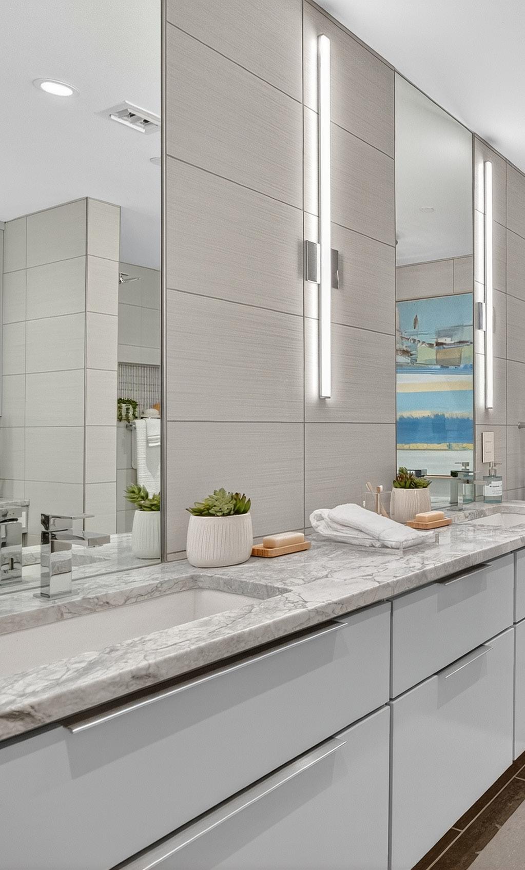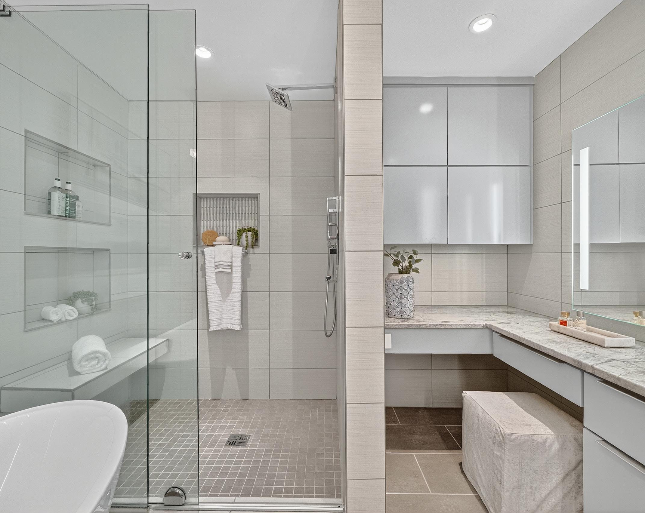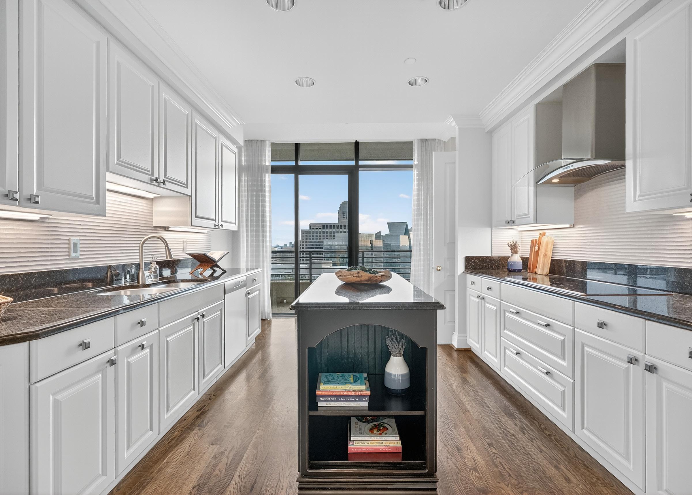 Refined living unfolds across a floor plan designed with elegance and practicality in mind. The kitchen takes full advantage of Downtown views and offers custom cabinetry, a walk-in pantry and direct access to the terrace for effortless entertaining. The primary suite is a private sanctuary with dual walk-in closets with a safe, custom electric blinds and a newly completed spa bathroom finished in soft gray stone with a glamorous sitting vanity, a lighted mirror and a private water closet.