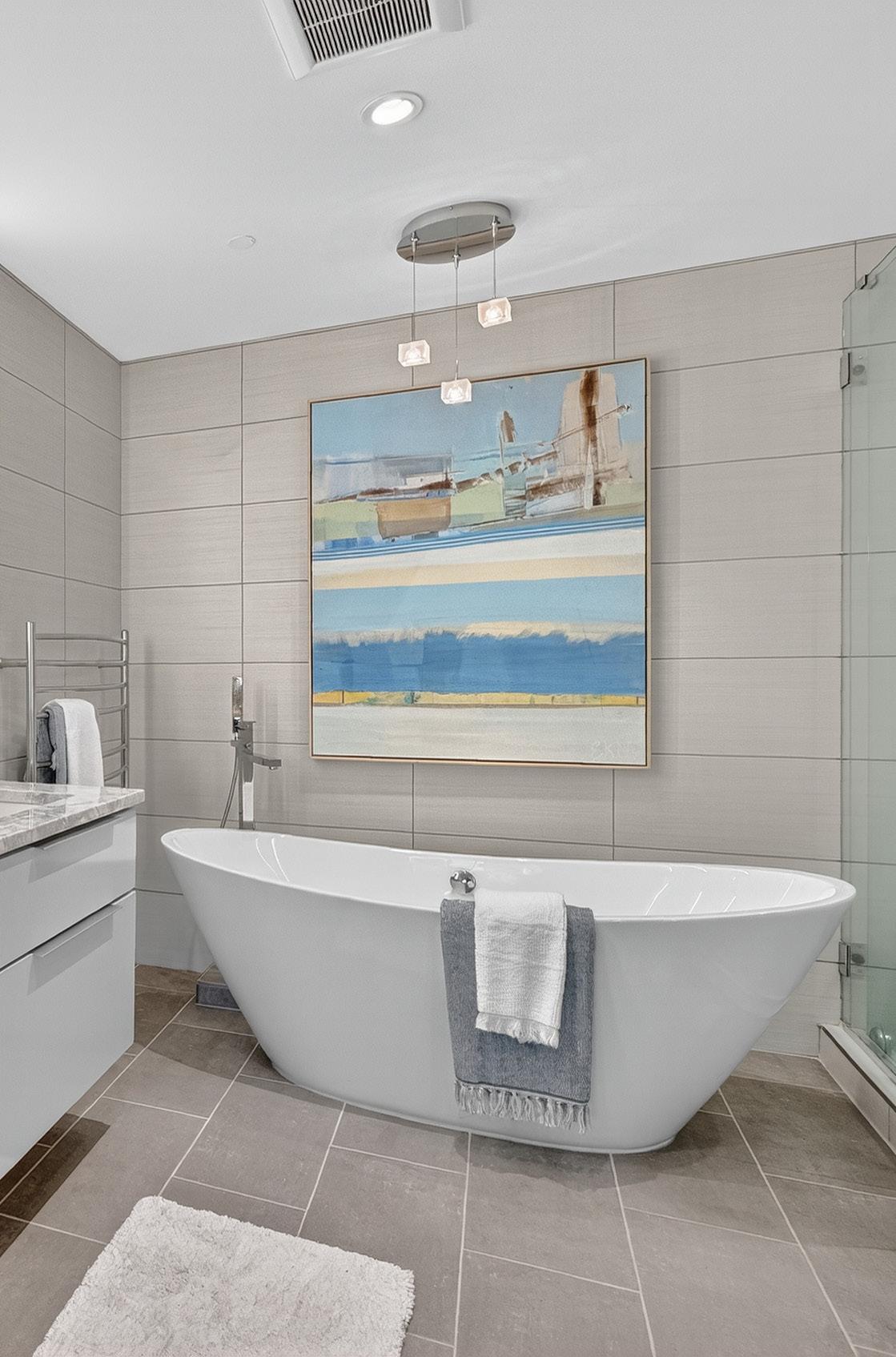 A secondary en suite bedroom also enjoys dual closets, while the paneled study with custom wooden bookcases doubles easily as a third bedroom. Throughout the residence, thoughtful details abound: freshly painted interiors, a laundry room with cabinetry and closet, a hall closet, soft-close cabinetry and subtle upgrades that ensure both beauty and peace of mind.