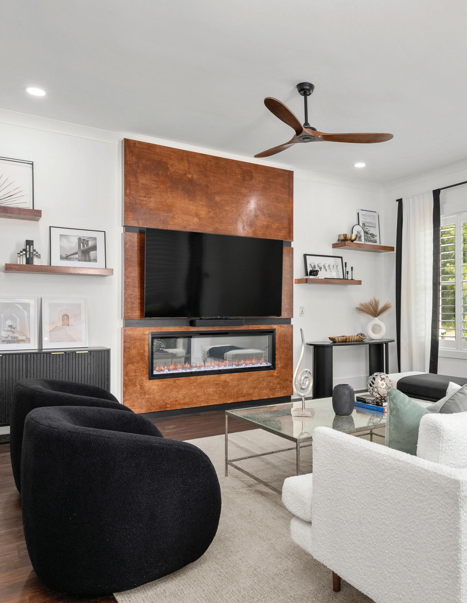 • Long linear electric fireplace + semi-modern mantel (TV ready)
