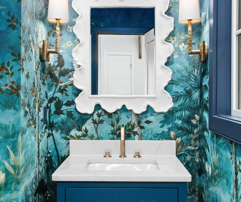 The powder room offers a moment of surprise and artistry, drenched in a rich blue landscape mural that envelops the space and elevates it into a memorable design moment. In the family room, oversized sliding doors blur the line between indoor