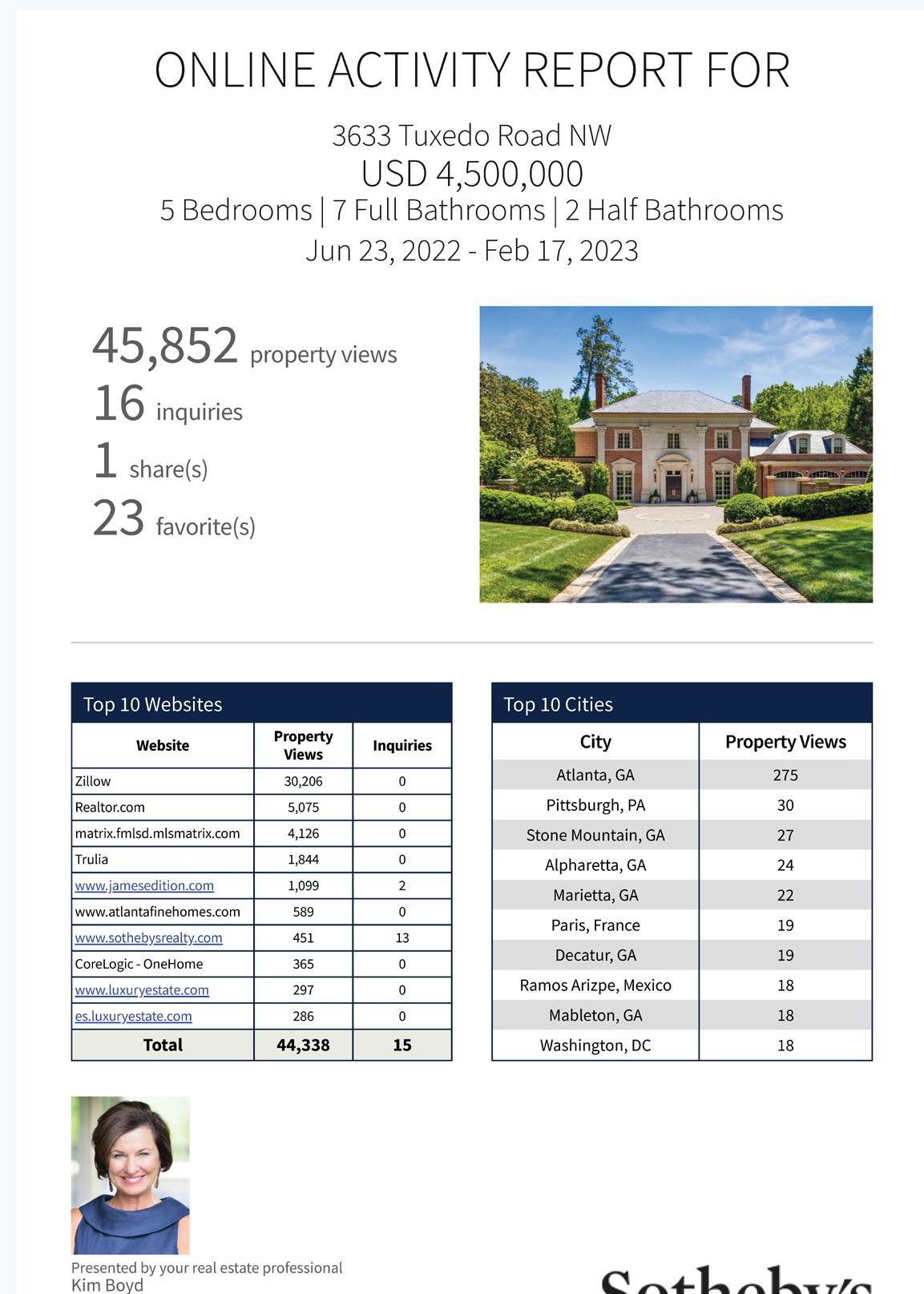 Strategic placement and unique positioning of your home’s best features are critical in securing the right audience to not only preview your home online, but also to take the next step in their home search. The Sotheby's International Realty brand partners with and distributes properties to the most significant media companies and real estate-focused websites in the world in order to increase exposure and drive the online consumer back to the rich content on sothebysrealty.com. To measure the results of this exposure, we provide a property report including view and inquiry statistics for each partner site to effectively illustrate the activity your home receives online. This allows us to keep you informed of our marketing efforts to sell your home.