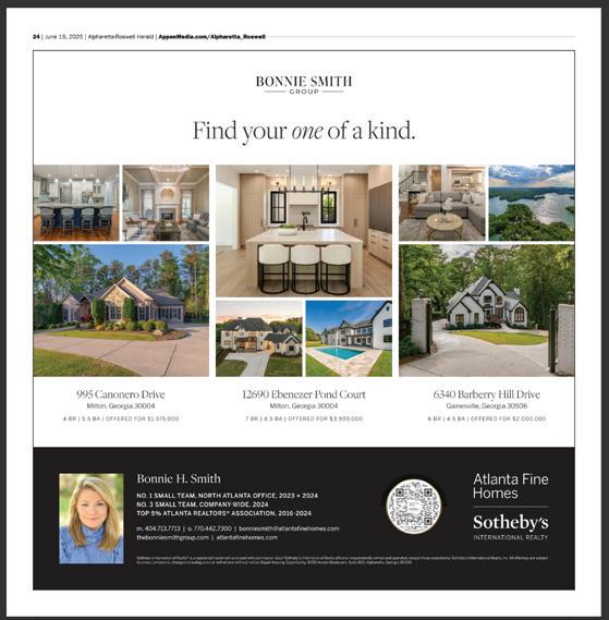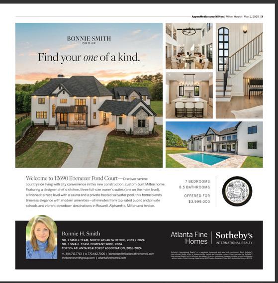 The Bonnie Smith Group advertises our listings in premier local and regional publications reaching 150,000+ readers across print and digital. Your listing will appear in monthly advertisements in the Appen newspapers, including the Milton Herald and Alpharetta-Roswell Herald. Additional reach comes through advertisements in Modern Luxury publications such as Interiors and The Atlantan.