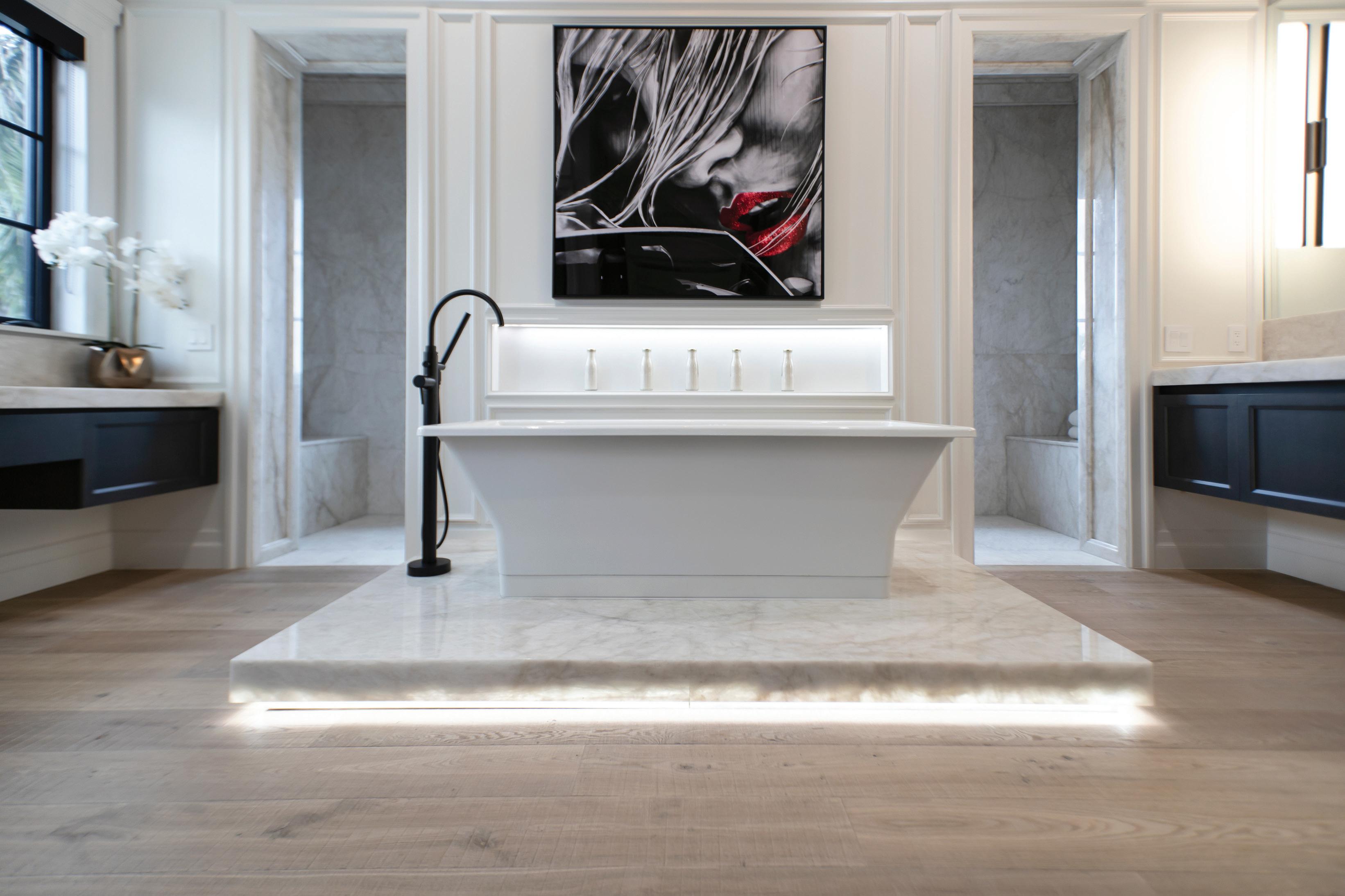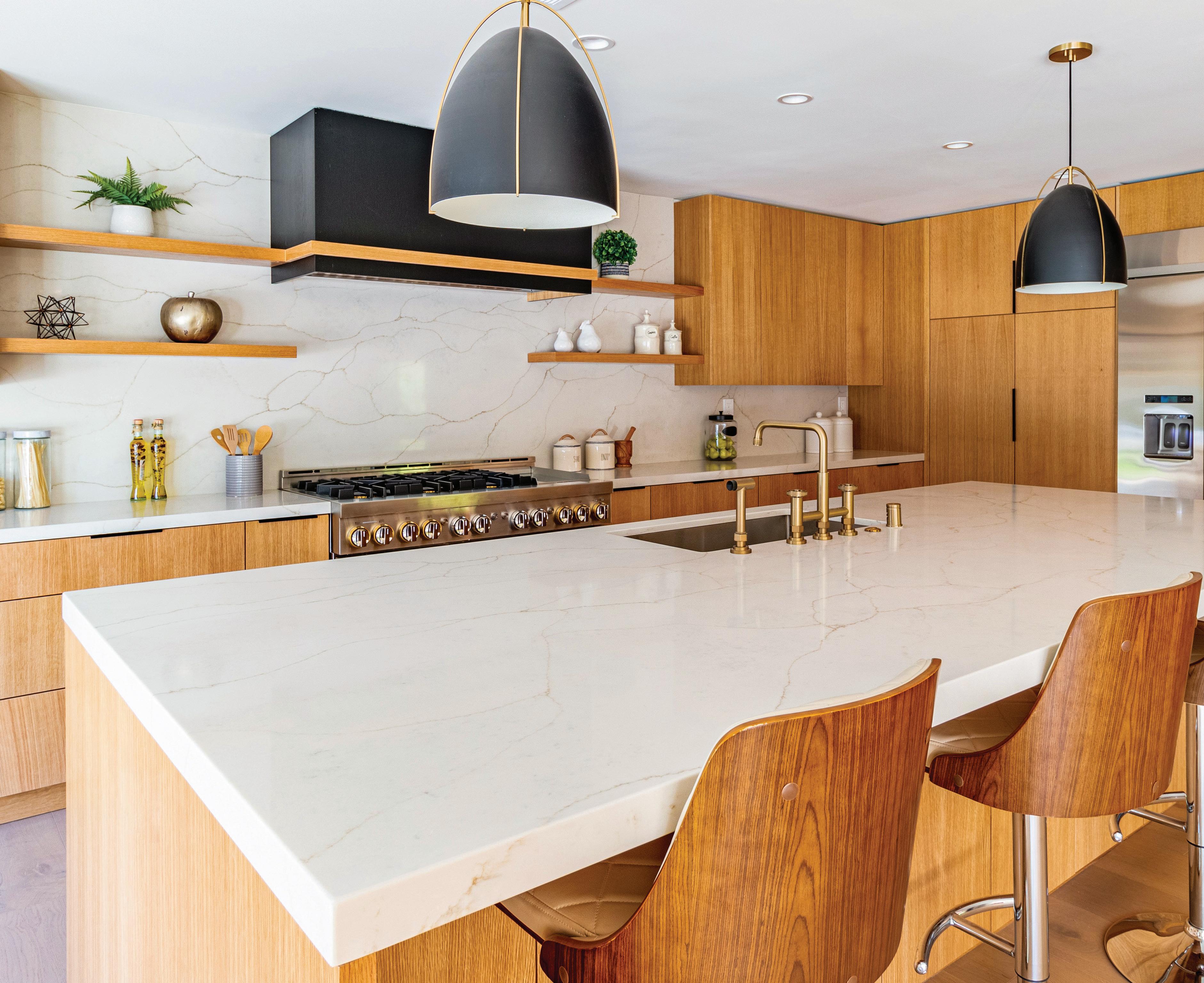 C r i s t a l l o Q u a r t z i t e , a b e l o v e d c h o i c e i n t h e d e s i g n i n d u s t r y f o r i t s d i s t i n c t i v e a n d t r a n s l u c e n t c h a r a c t e r i s t i c s , c a n i n f u s e y o u r s p a c e w i t h u n p a r a l l e l e d e l e g a n c e D e s i g n e r B R I D G E T T E C A P O R A S O u t i l i z e d o u r c r i s t a l l o q u a r t z i t e t o c r e a t e a s o p h i s t i c a t e d f o c a l p o i n t i n b o t h h e r b a t h r o o m a n d k i t c h e n .