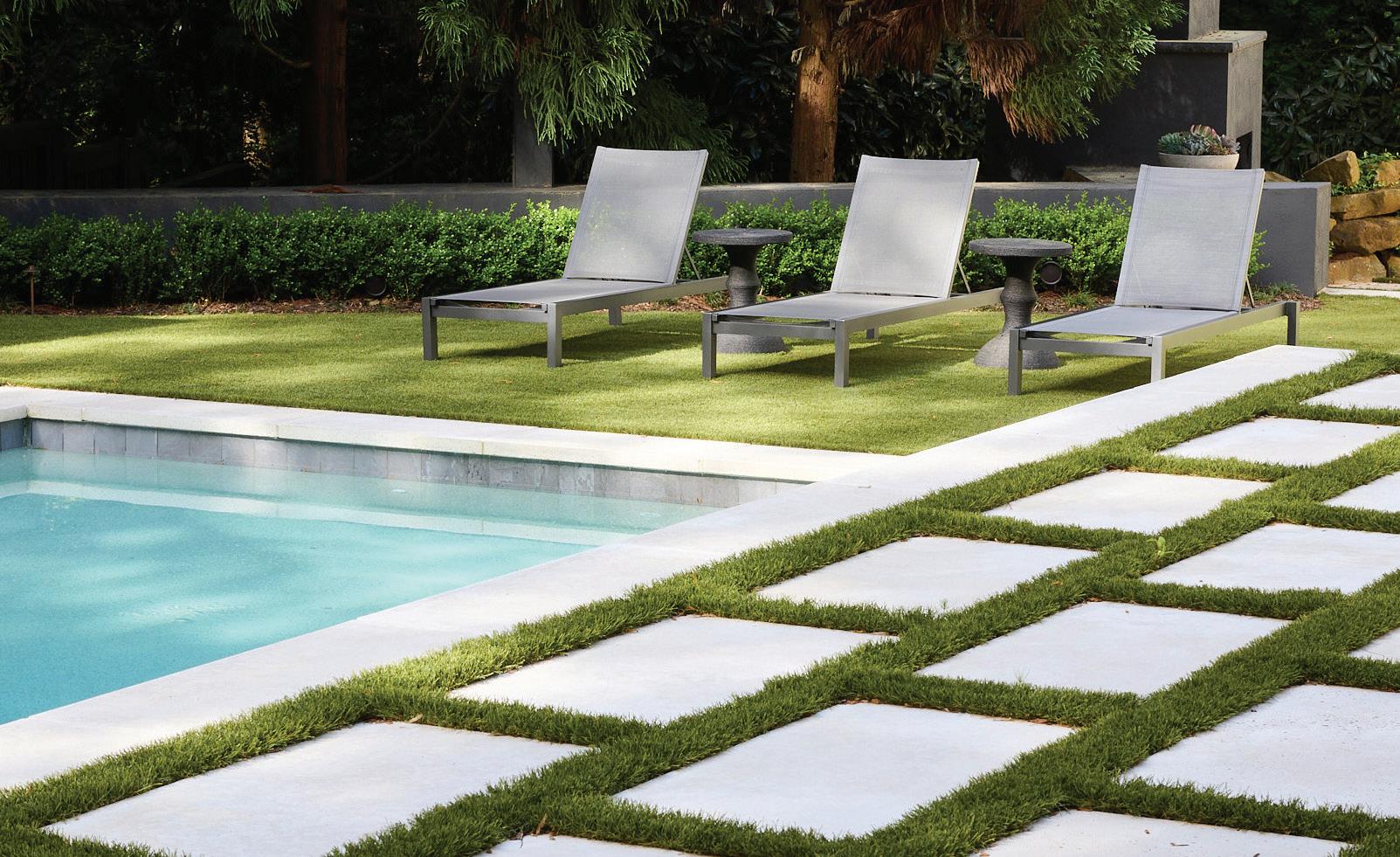 A round cast stone table anchors a pool lounge, while upholstered seating in lightweight fabric tempts swimmers to take a break. See the September 2021 issue on atlantahomesmag.com