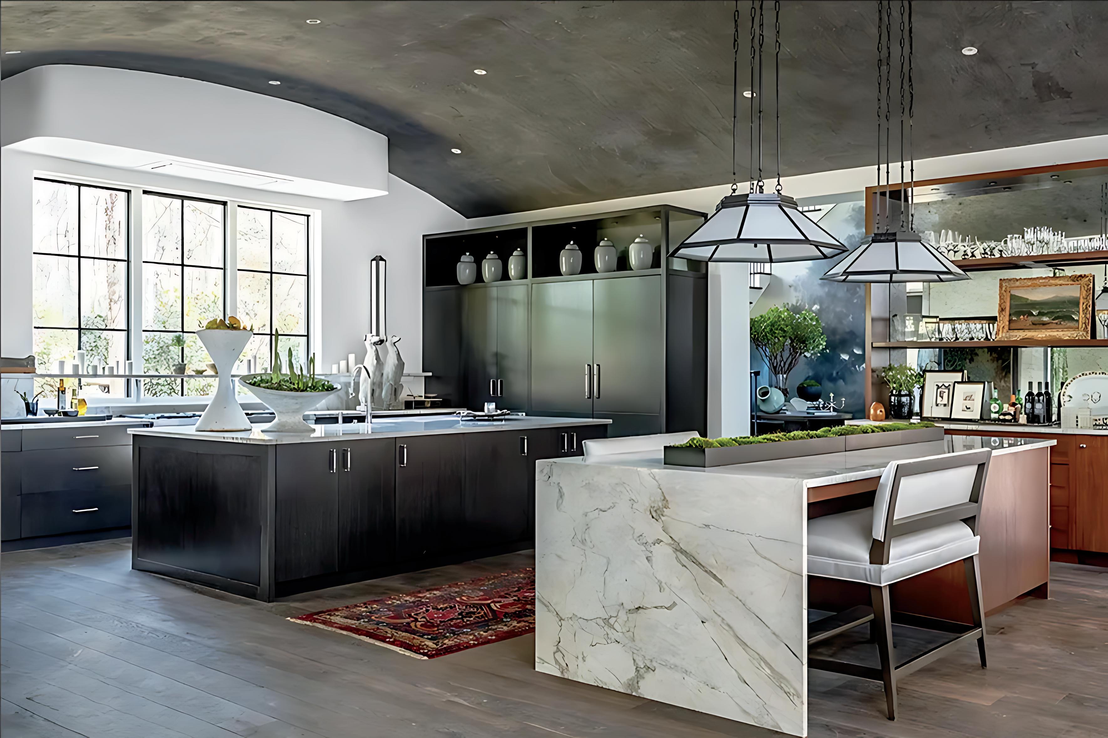 As part of the expansive primary suite on the first level, a spa-like bathroom dazzles with an exquisite use of steel, glass, and tilework. Throughout the home, luxurious finishes, including marble, limestone, and porcelain slab, present a play of masculine and feminine with a fresh take on the classics. An additional four bedrooms with en suite bathrooms, as well as an additional laundry area, are on the second floor. The lower level is a haven for hobbies and activity with a theater, game room, gym, and wine cellar.