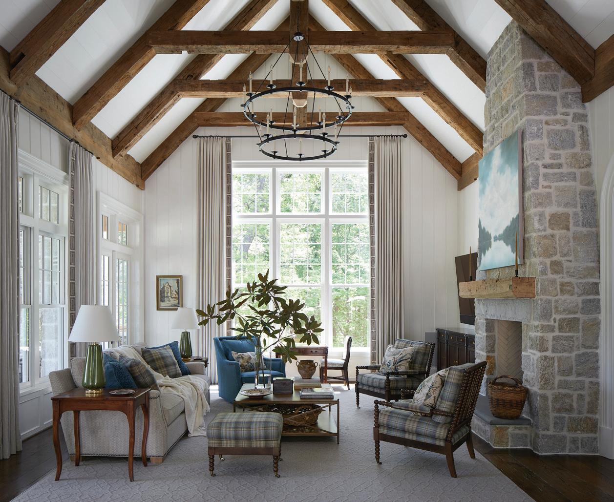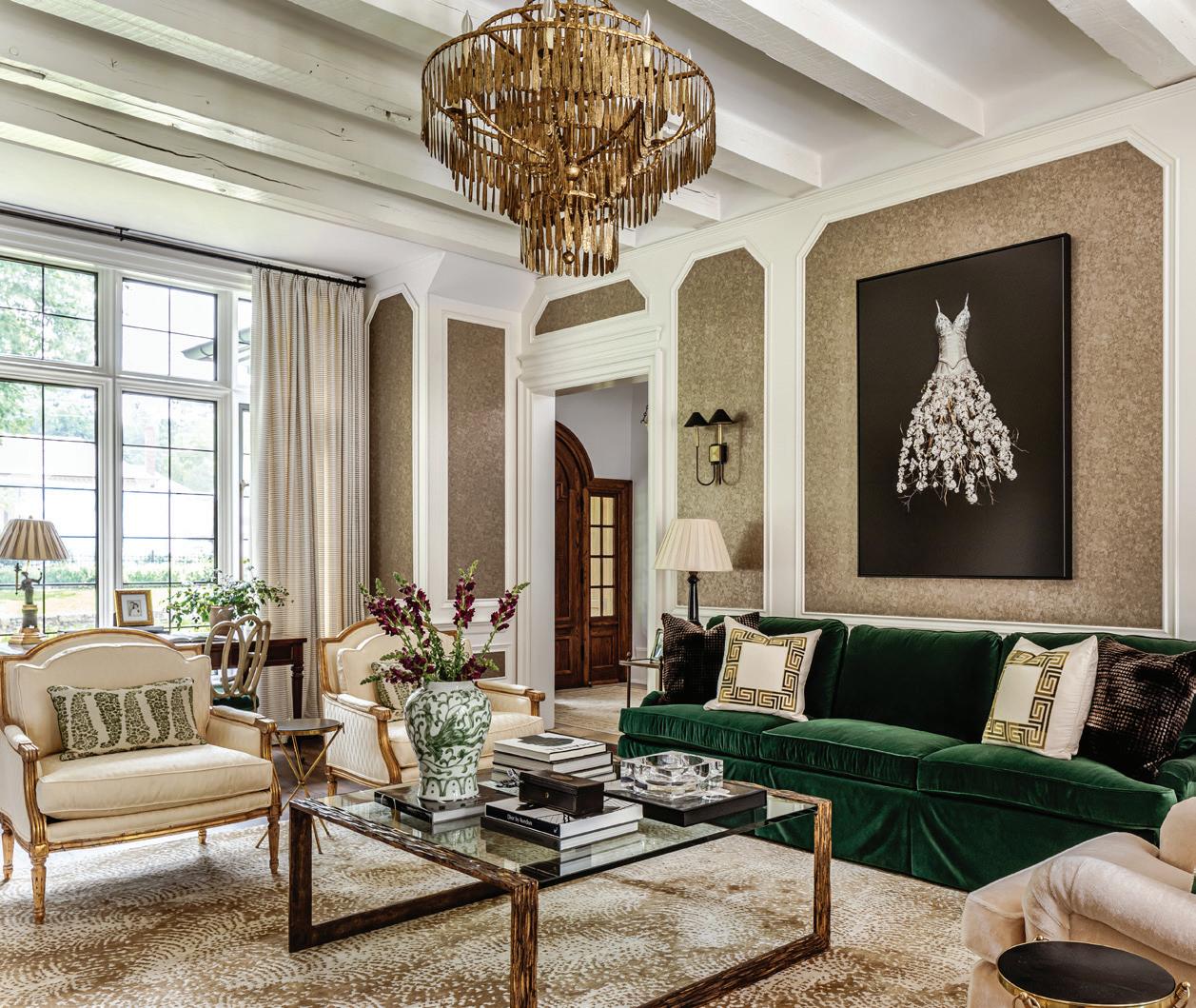 In this elegant formal living room, painted beams and millwork create an inviting ambiance. The wallcovering with a subtle shimmer adds a touch of glamour, while an unexpected modern chandelier enhances the space. See the October 2023 issue on atlantahomesmag.com