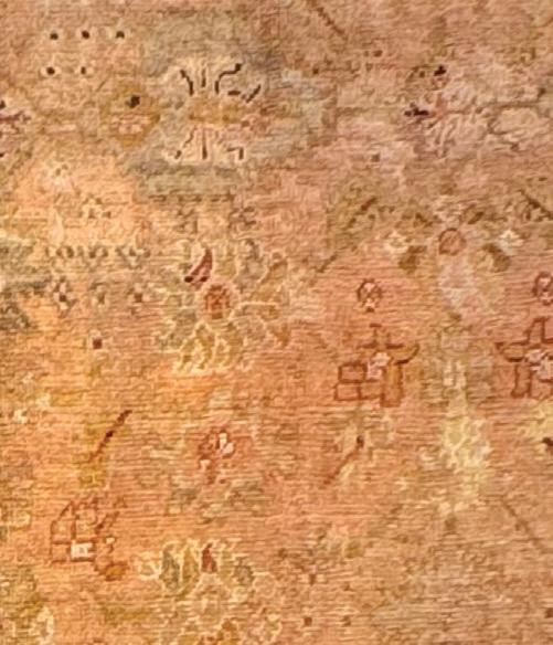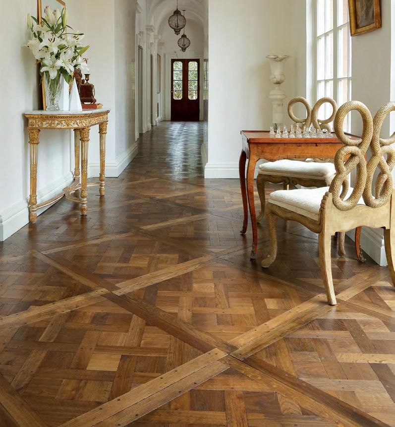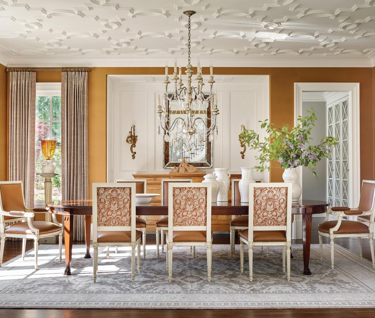 While this dining room’s caramel-colored silk doupioni wallcovering may be unexpected, it anchors the serene tableau with all the elements and details in perfect proportion. The niche, with its traditional creamy white paneling, sets off the antique sideboard.