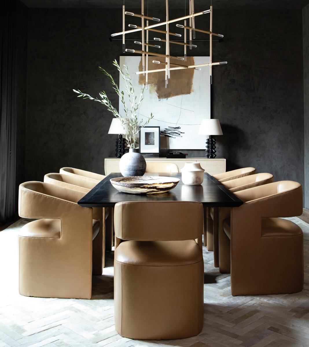 A sleek and sexy dining room designed for a young couple who loves to host a gathering. Enveloped in depth and richness, it is the perfect se ing for a sophisticated soirée.