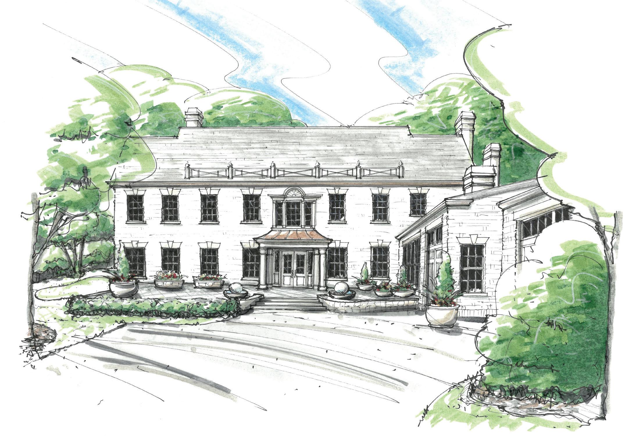 A sweeping driveway and mature trees lead to a graceful motor court with a three-car garage and landscaping by FLORALIS GARDEN DESIGN. A new front door facing Tuxedo Road serves as the main entrance. With careful attention to the past, the original front door facing Northside Drive is being restored and
