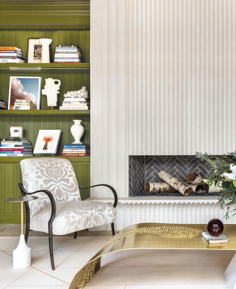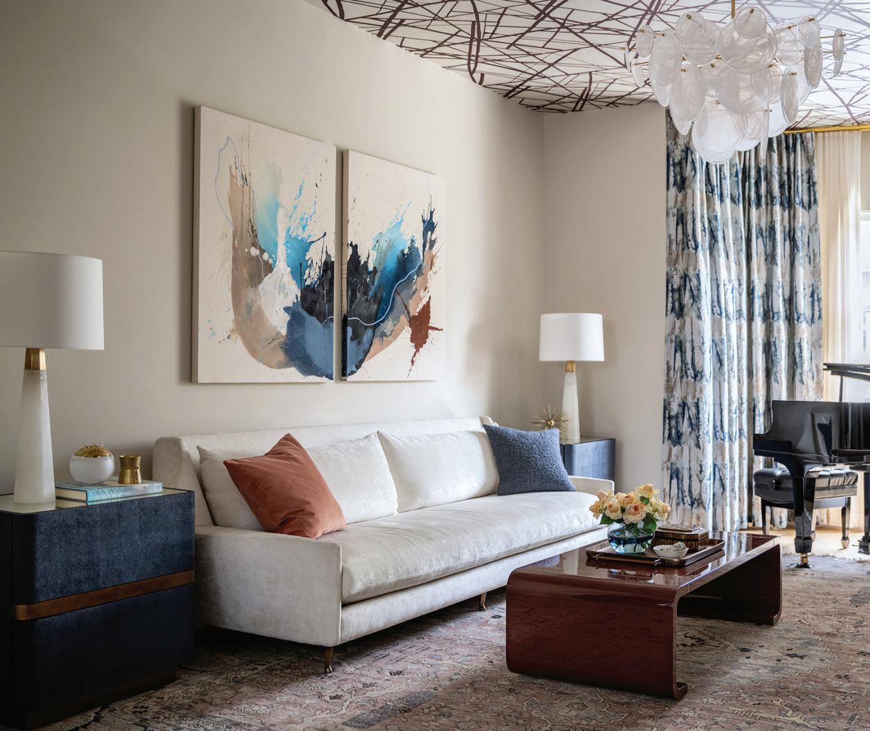To infuse vibrancy into a contemporary setting, Joy Street Design incorporated an array of patterns and textures to craft a space that feels welcoming. The geometric wallpaper on the ceiling serves as a striking contrast to the intricate fabric of the curtains and classic rug.