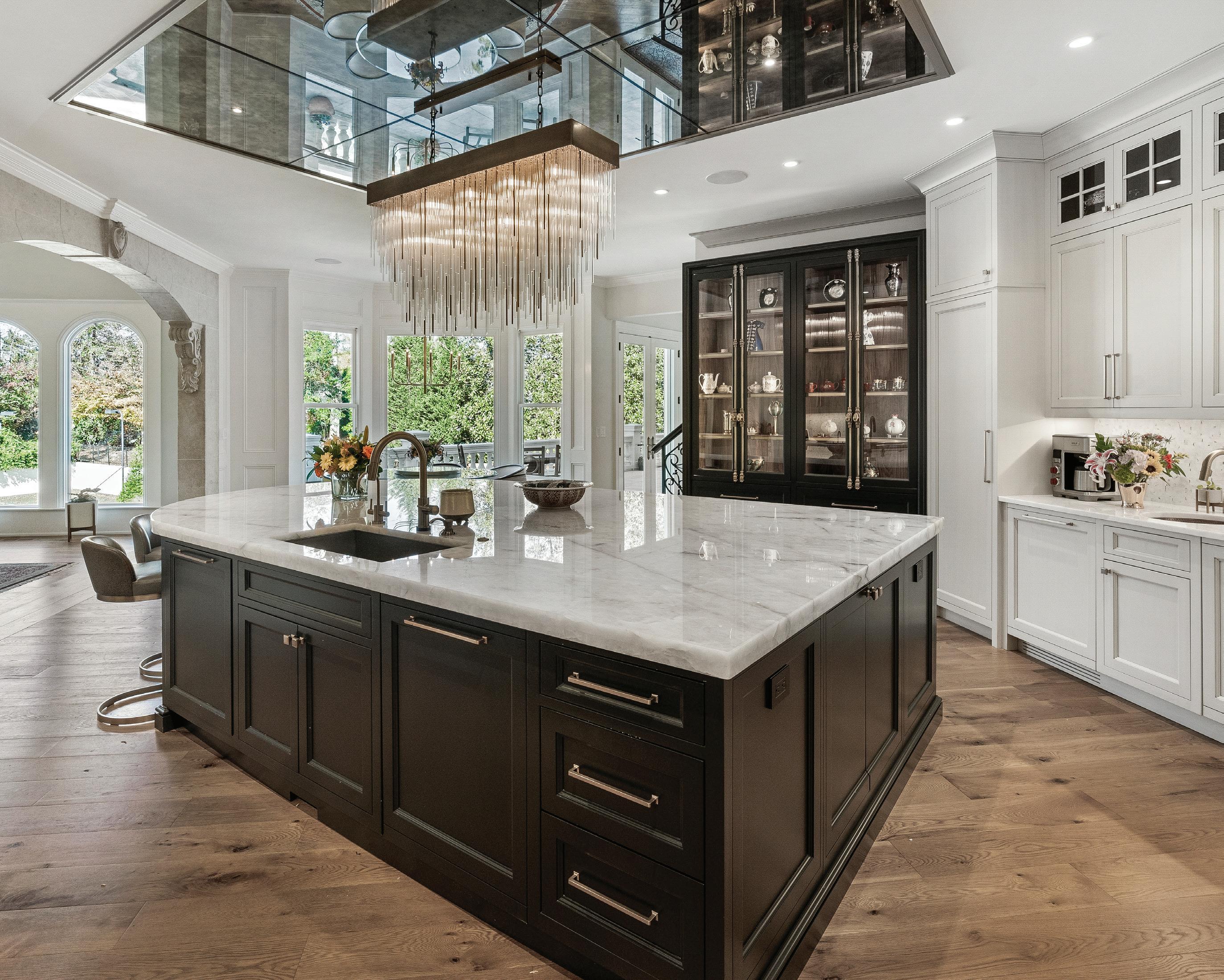 Openness prevails in the reimagined floor plan that includes a two-story grand hall and new entertaining spaces, such as a family room with a fireplace and coffered ceiling and a kitchen with a hidden scullery. The design-build team reshaped the flow while maintaining the symmetry of the living room, dining room, and historic paneled study. Surprises, such as a sexy speakeasy, infuse the redesigned property with intrigue.