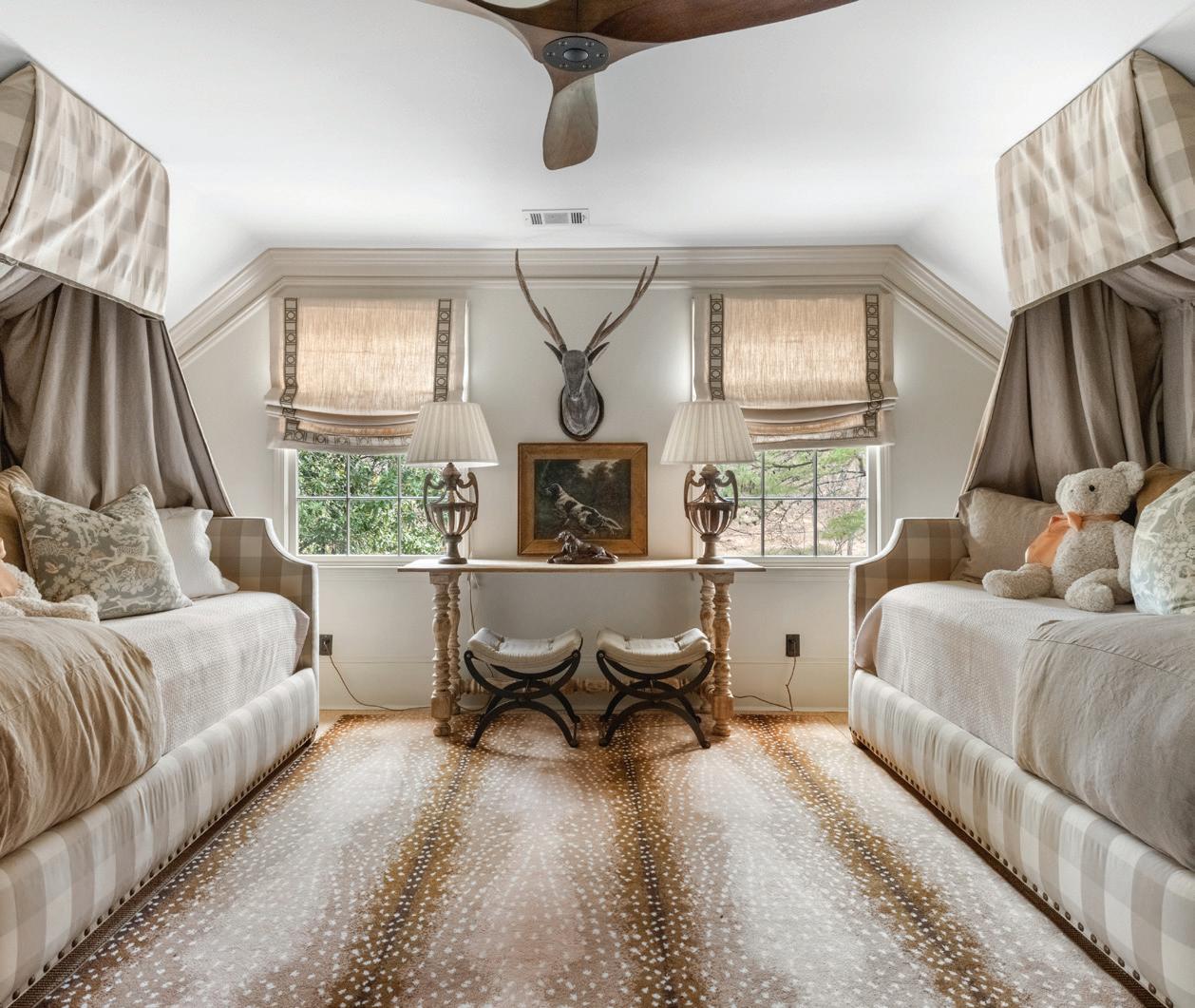 Two canopied twin beds upholstered in beige-and-white patterned fabric sit opposite each other, and a speckled rug adds whimsy to the cozy children’s room.