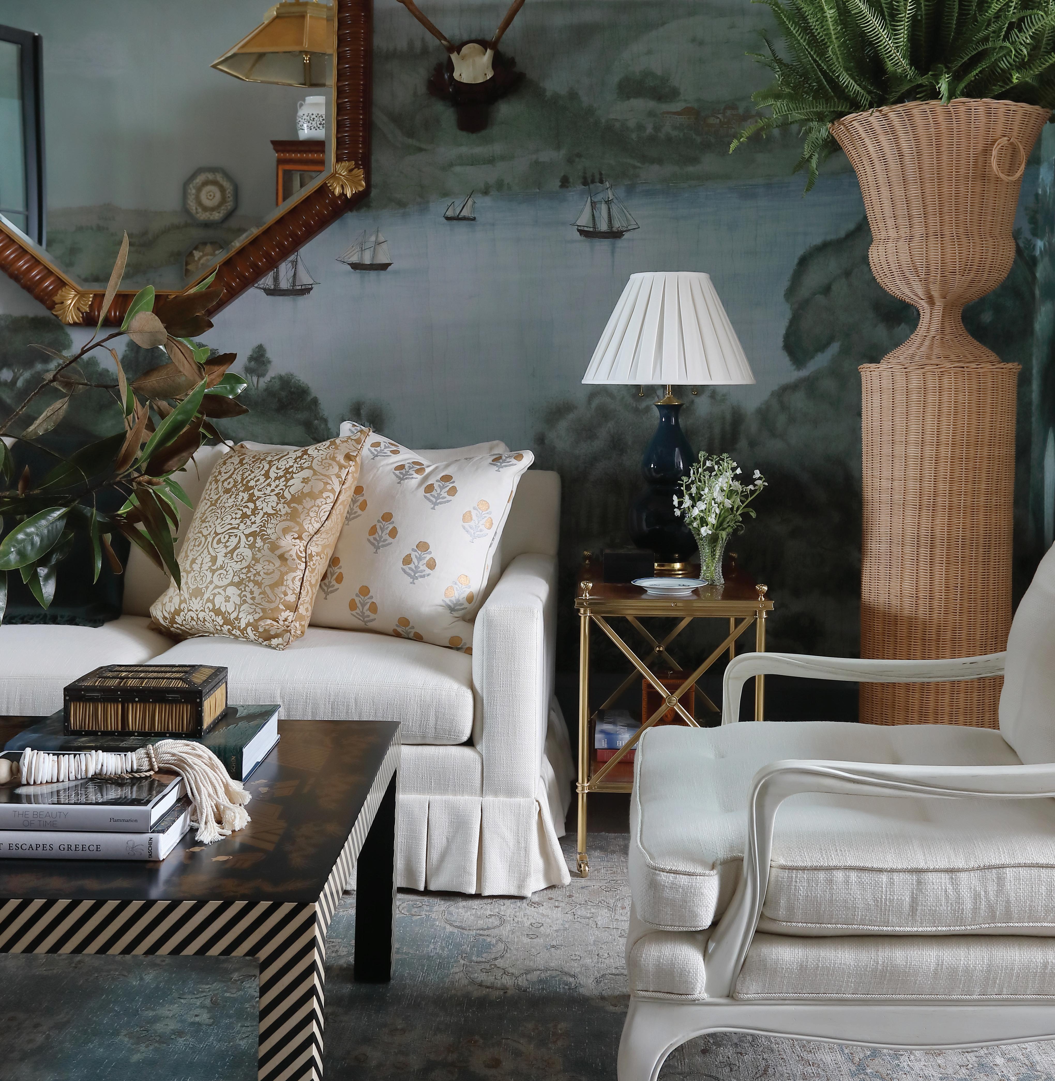 A moody study features a dramatic Iksel wallpaper, which was designed after a lithograph printed in the 1850s. The mix of new and antique furniture, hand-printed fabrics, and textures—such as the wicker urn—make the space just right for today. See the September 2022 issue on atlantahomesmag.com