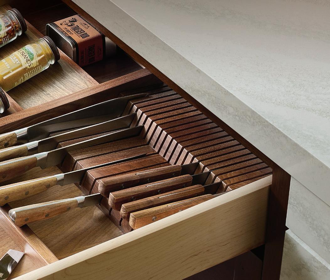 With plenty of space for entertaining, a cool-toned island contrasts with warm cabinetry and metal accents in a bright and airy kitchen. Visit morgancreekcabinets.net