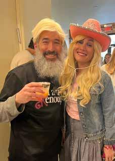 What came before that was a rousing Megillah reading, cocktails, and appetizers before a seated dinner in the intimate, brick clad social hall. Stunning brunette Dena Schusterman, founder of Intown Jewish Preschool and Hebrew School, was clad in a pink cowboy hat trimmed in silver glitter, gold boots, and a long flowing blonde wig as Barbie, opposite the rabbi in his blonde Ken wig. On a more serious note, their back sides supported the yellow symbol for release of the hostages.
