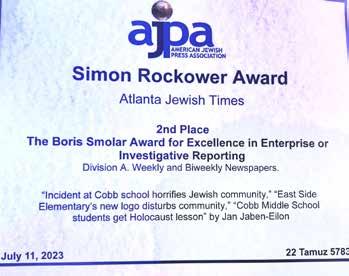 Schechter said, “Recognition by the American Jewish Press Association, through its Rockower Awards, is appreciated. My thanks to the Atlanta Jewish Times and the Jewish Telegraphic Agency for publishing the articles that were hon-