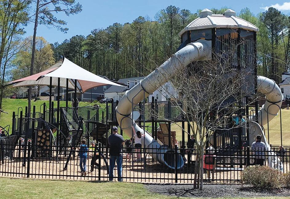 This Forsyth County park offers natural shade on the two-story playground that includes slides, climbing structures, interactive elements and more. Kids will especially love the spider web-like climbing structure, and there is an accessible swing.