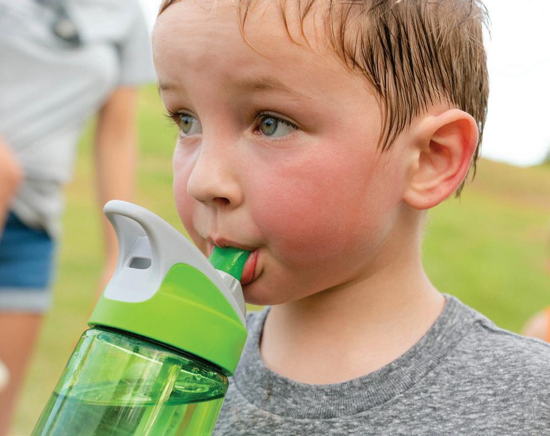 Don’t wait until your child is thirsty to encourage them to hydrate. Serve water 30 minutes before an activity. Kids who weigh less than 90 pounds should aim for five ounces of water every 20 minutes, and those who weigh more than 90 pounds should aim for eight ounces every 20 minutes.