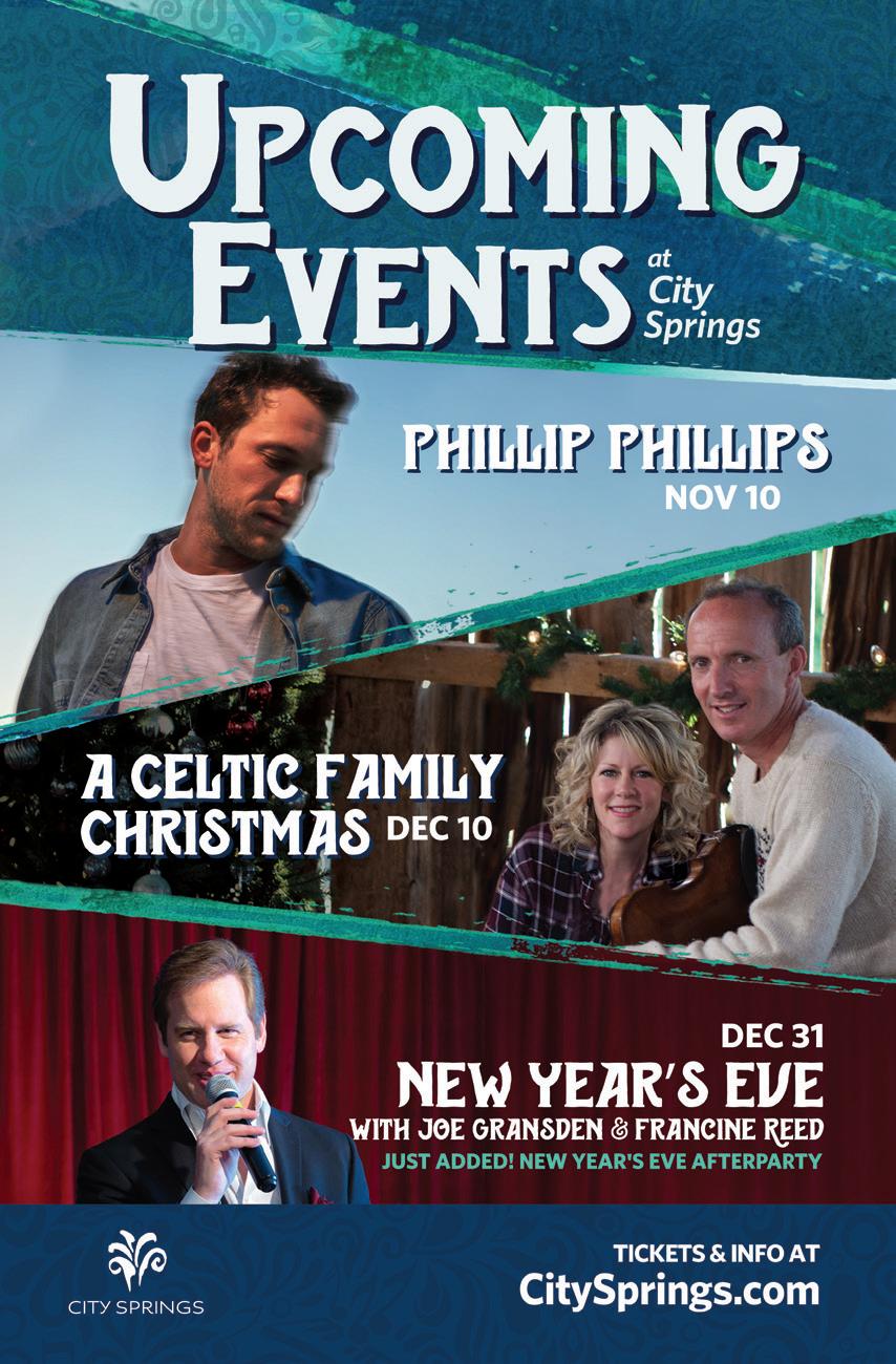 The excitement for the holiday season is building here at City Springs! November 10, American Idol winner Phillip Phillips brings his biggest hits, “Home,” and “Love Like That” to the Byers stage; American Authors (Acoustic), whose upbeat hit “Best Day of My Life” was a chart-topper for months, opens the show. Tickets start at $52.50; a limited number of VIP tickets are available at citysprings.com/events.