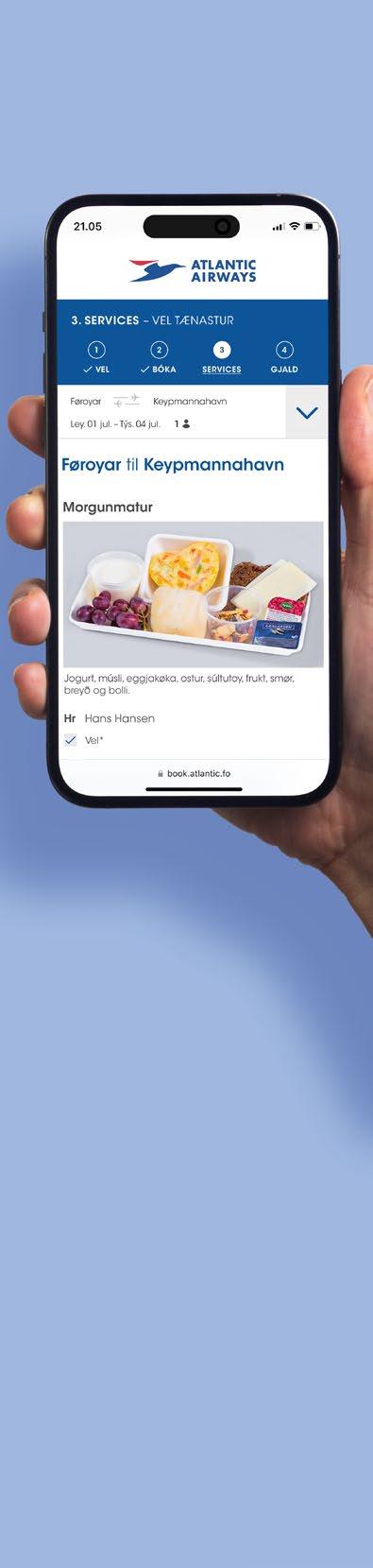 Tú fært eitt størri úrval av mati at velja ímillum, tá ið tú bíleggur frammanundan. Tað kanst tú gera heilt til 24 tímar áðrenn fráferð (SÓL-ferðamál 48 tímar).