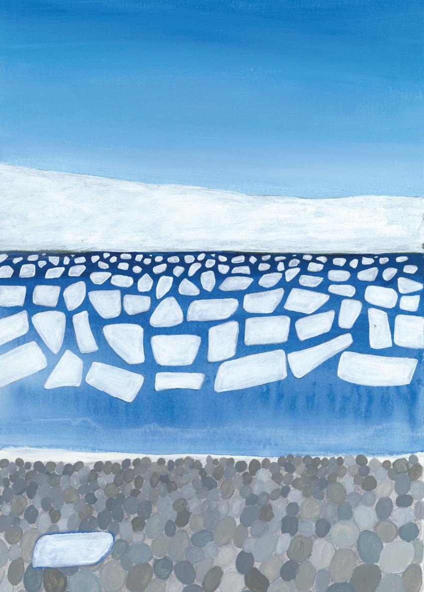 watercolour illustrations feature thick, dark outlines and a flat aesthetic. Loose-lined and suffused with light and with an abundance of blue on each page, they capture the folkloric tone of the story and its watery milieu. With both the English and Innu-aimun text, this story introduces children to both this language and a foundational myth of Indigenous peoples, providing a welcome glimpse into Innu culture.
