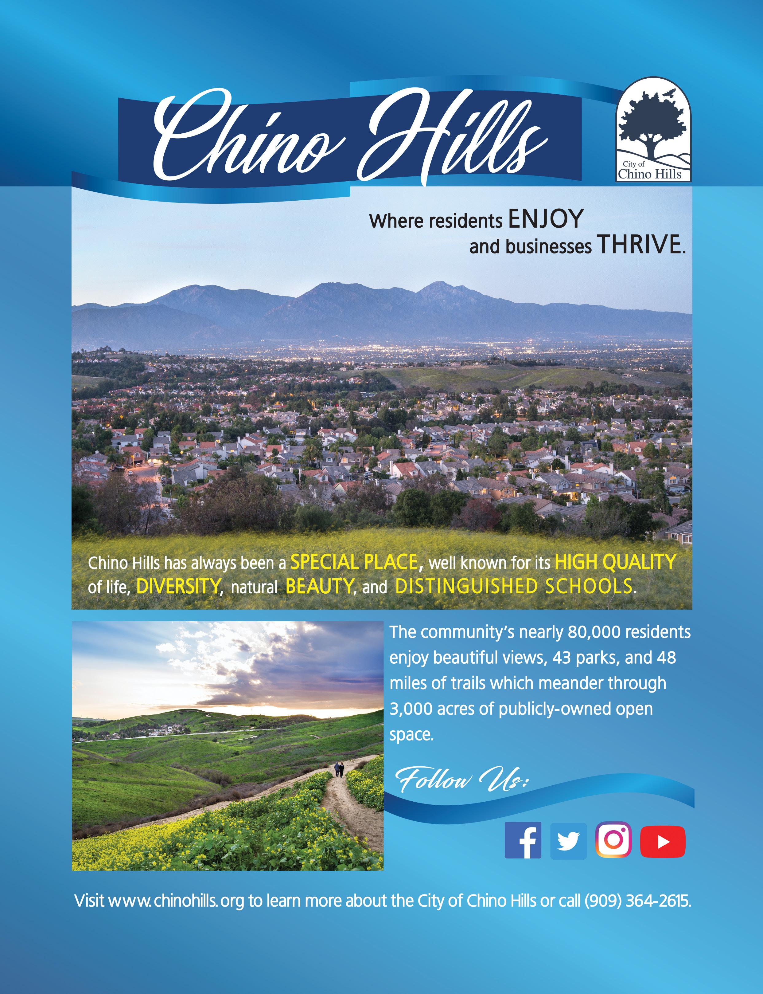The City of Chino Hills is located in the rolling hills of southwestern San Bernardino County, adjacent to Orange, Riverside, and Los Angeles Counties. The community has retained its rural character and open spaces and fostered the development of vibrant commercial corridors.