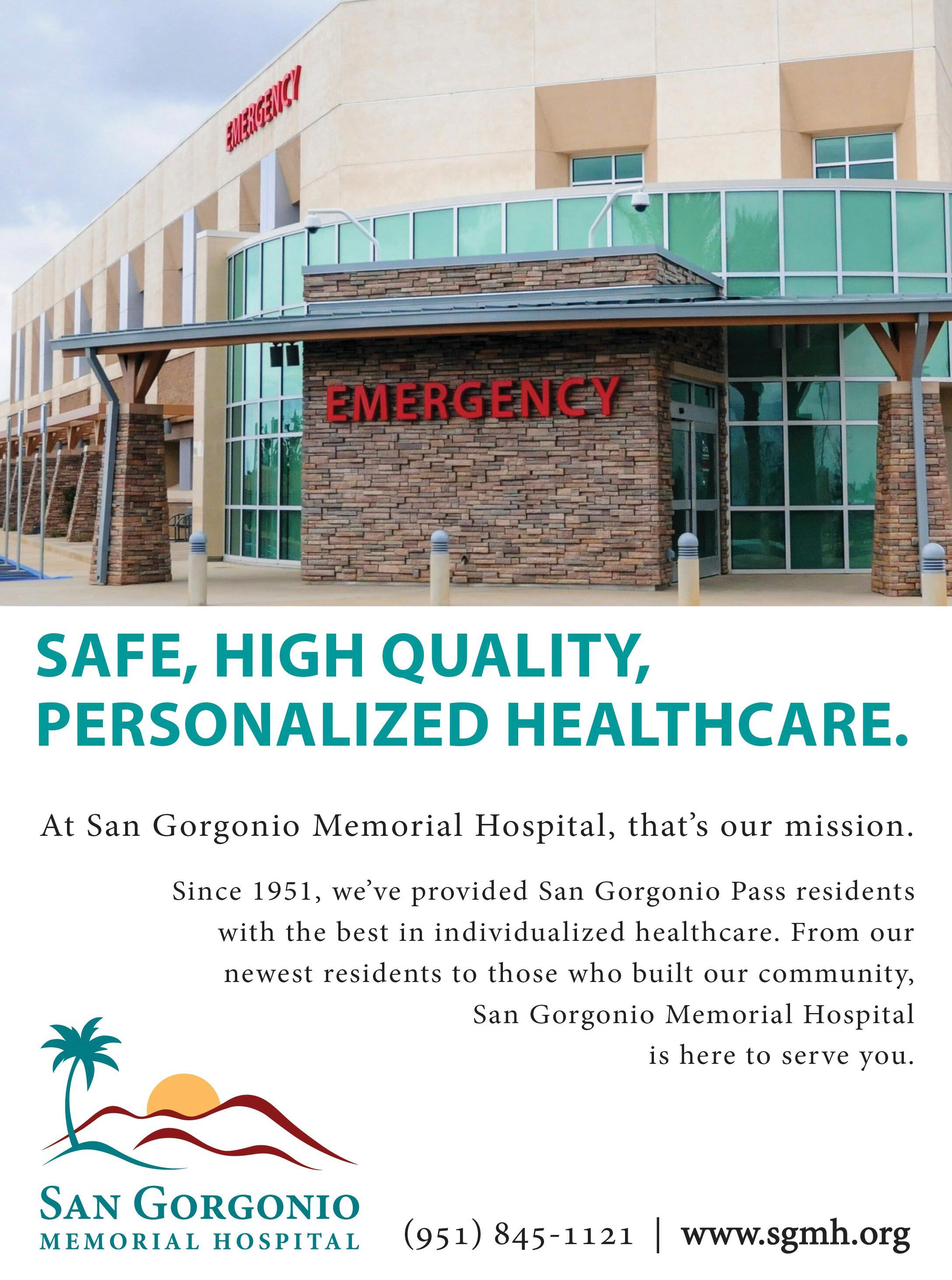San Gorgonio Memorial Hospital’s mission is to provide safe, high-quality, personalized healthcare services. This 79-bed facility located in the San Gorgonio Pass area was established in 1951 as a living monument to our country’s World War I and II veterans. Now in its 66th year, San Gorgonio Memorial Hospital continues to provide excellent care to the community it serves and is proud to consider patient safety as its number one goal. With its mission in mind, San Gorgonio Memorial Hospital recently renovated its Emergency Department continued on page 10 >
