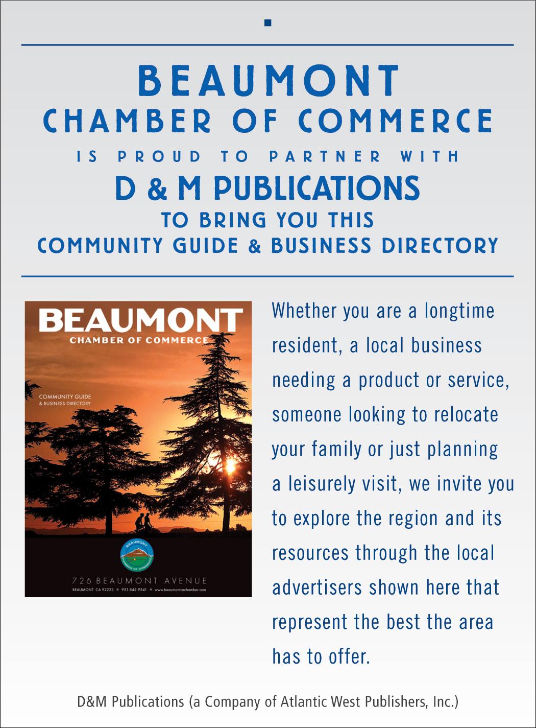 Some people, however, set down roots, drawn by the beautiful Mountain vistas; clean, crisp air; and the abundance of cherry and apple orchards. Beaumont is proud of these early settlers and their families, many of whom continue to live and thrive in Beaumont. We invite you to explore the pages on the City website, www.ci.beaumont.ca.us, and discover why Beaumont is so proud of its past…and so excited about its future.