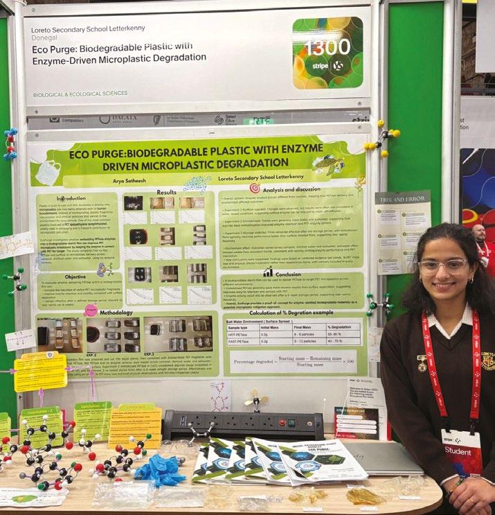 Arya Satheesh from the Loreto Secondary School Letterkenny, Donegal received support and access to ATU facilities in the Letterkenny campus while undertaking research on her project ‘Eco Purge: Biodegradable Plastic with EnzymeDriven Microplastic Degradation.’ Arya
