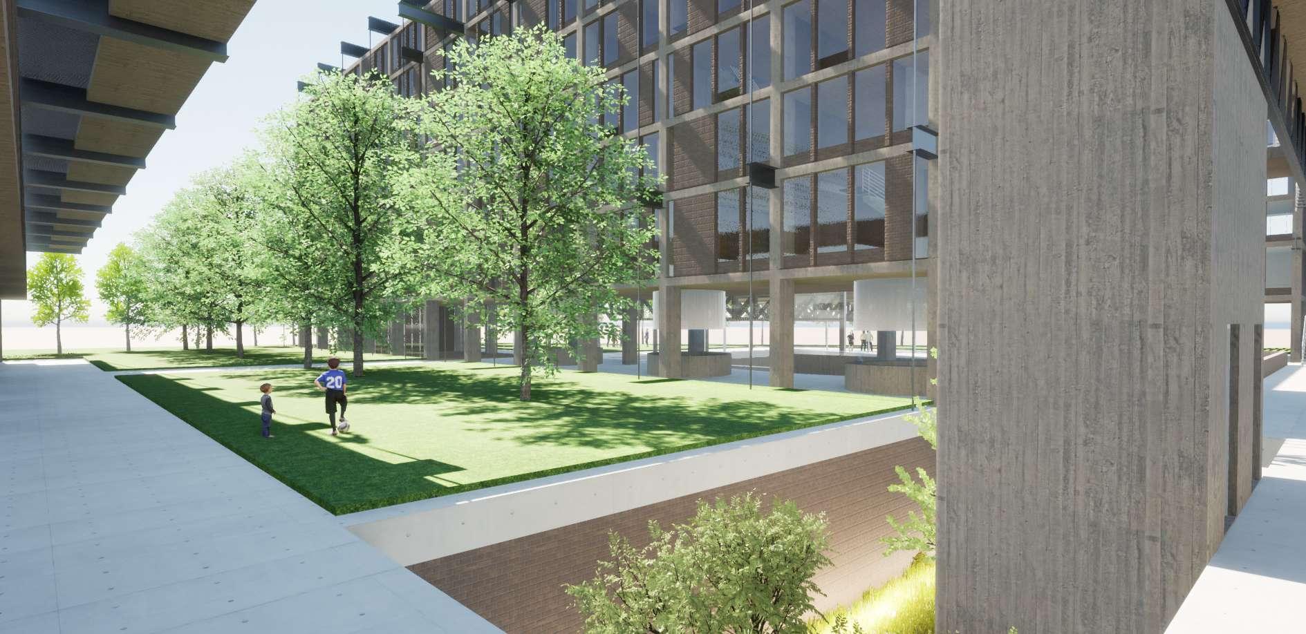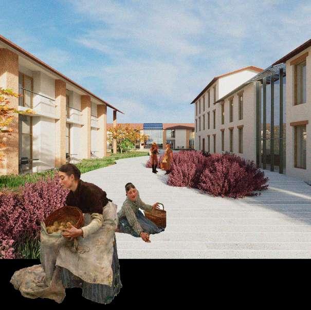 Dire ct conexion with the metro station and the sp or t facilitie (velodreme). There is a main axis with the main circulation across the projec t, but also there are many circulations perpendicular to this axis