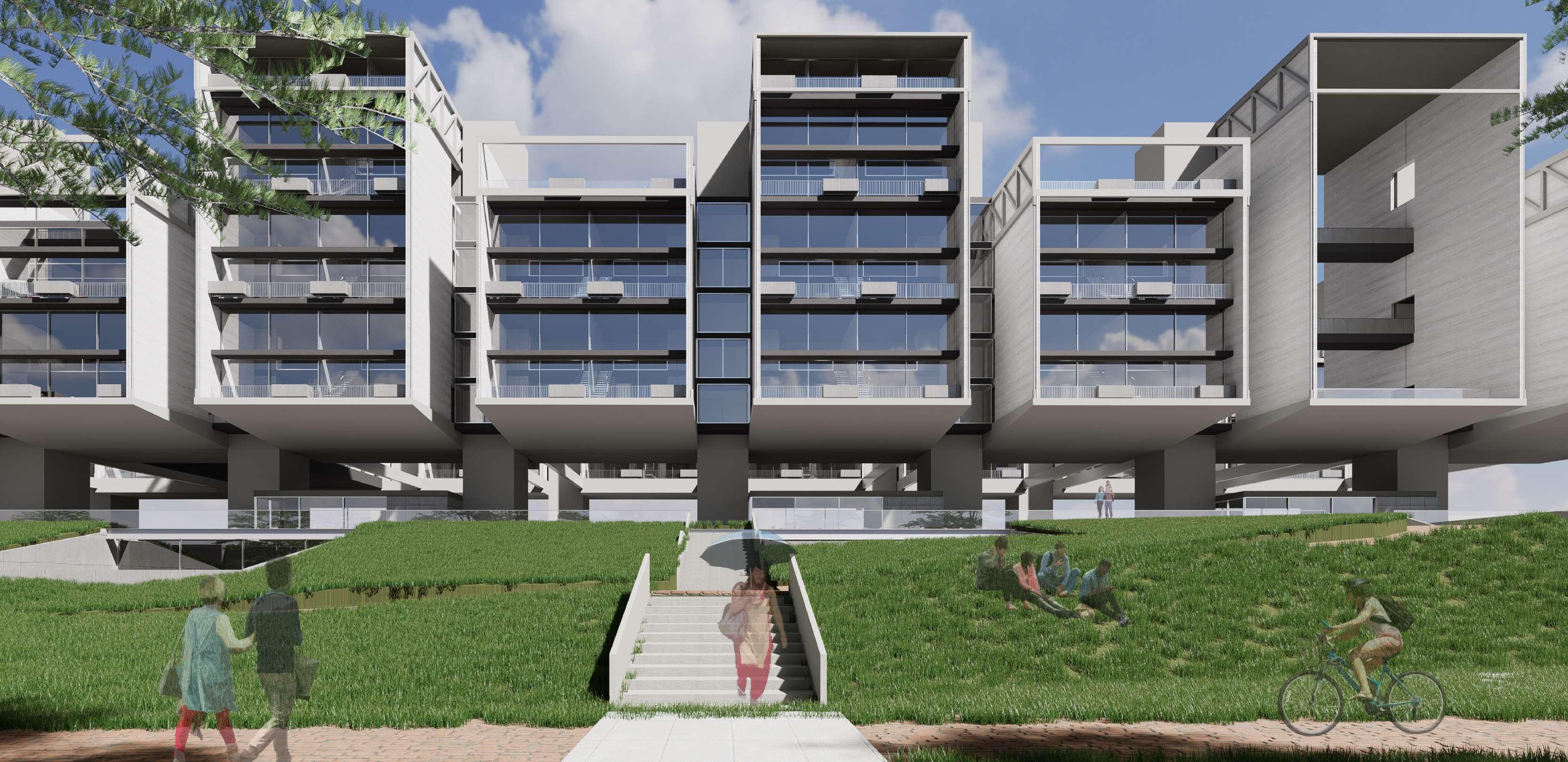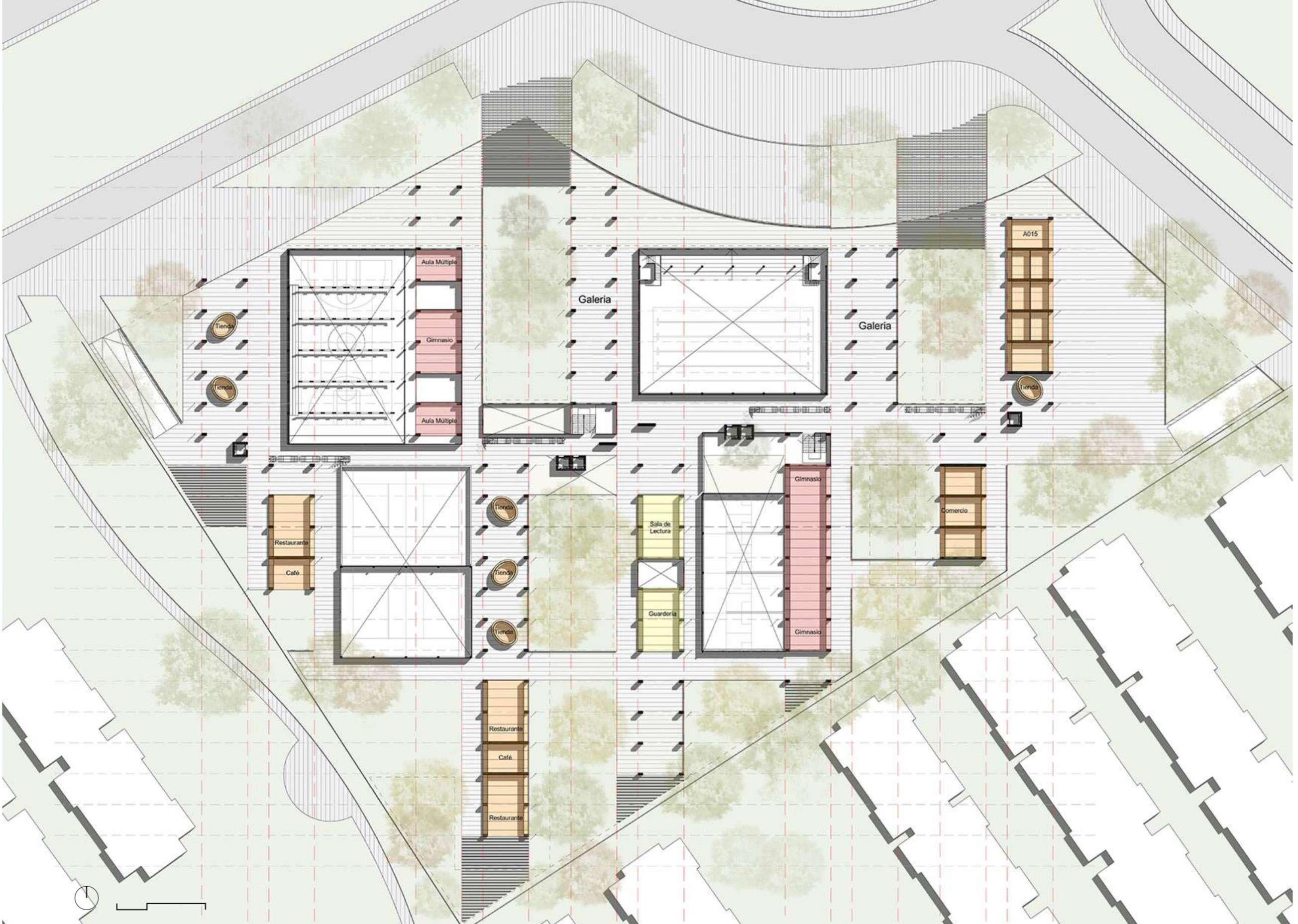 The project it’s located in a future planned park. In order to keep the continuity of the park the cultural component occupies the underground floor, releasing the first floor with an artificial topography that covers part of the building. The housing is distributed throughout modules with a suspended structure that avoids the necessity of a conventional pilar structure, allowing a free plan structure in the basing.