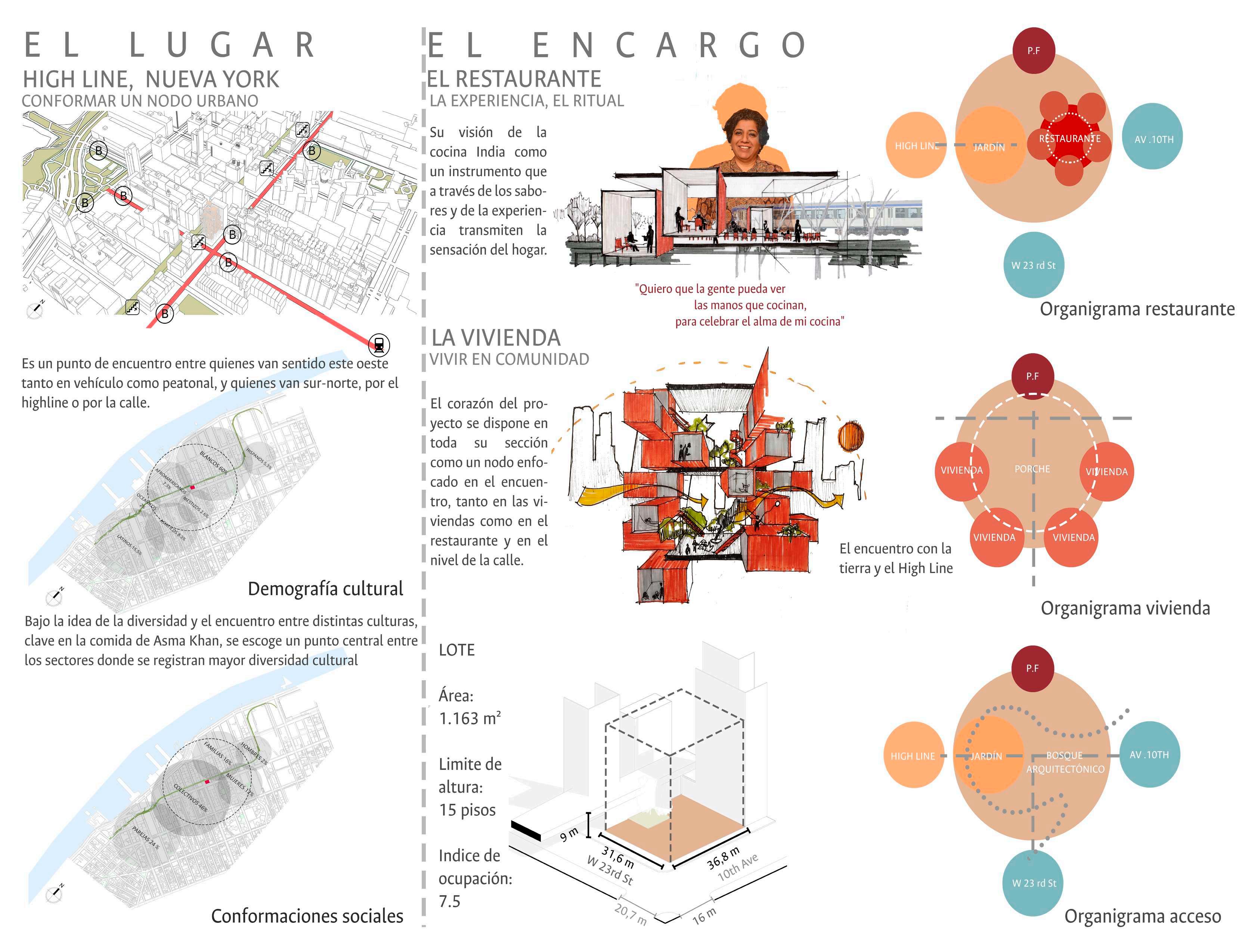 The building program is divided into two parts, the housing and a restaurant for the chef Asma Khan; these two components of the program are articulated under the idea of community. In the case of the restaurant, the integration of diners with the cooking process is sought, like what happens in the chef’s restaurant in London. On the housing side, the idea of a traditional neighborhood is recreated, but vertically, through central atriums that allow the residents to appropriate these spaces.