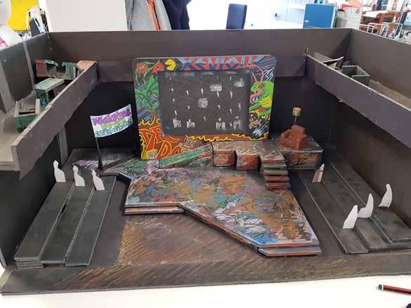 Surrounding the screen is a frame painted with images from the various video games that are mentioned in the play. The game cabinets are treated in the same way; an abstract version of images from the games. Young people form the Kakanoa Youth Trust at Corban Estate Arts Centre in West Auckland are