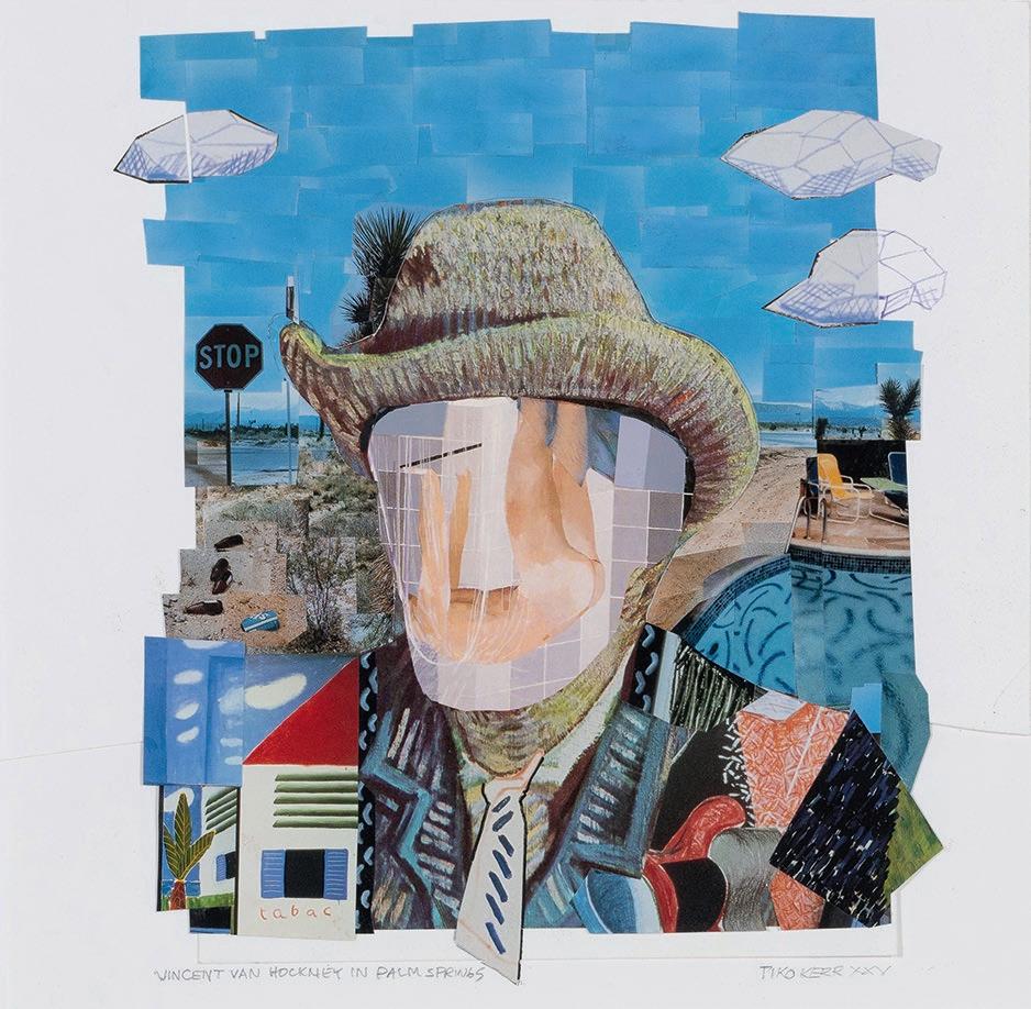 Tiko Kerr (1953 - ) is a visual artist, born in Edmonton, Alberta, who lives and works in Vancouver. His artistic exploration centers on perception, employing chance and improvisation across diverse materials and methodologies. Vincent van Hockney in Palm Springs features a central figure that draws from Van Gogh’s Self-Portrait with Grey Felt Hat, while the patchwork sky references David Hockney’s Pearblossom Highway, 11–18 April 1986 #1. Through this layered collage, Kerr speculates on an alternative history—imagining Van Gogh experiencing the same unapologetic sexual freedom and luminous desert light that Hockney embraced. The work envisions Van Gogh at peace, aware of the profound impact his art has had on generations that followed. With its vibrant colour, expressive mark-making, and art-historical dialogue, this homage is a compelling and meaningful addition to any collection.