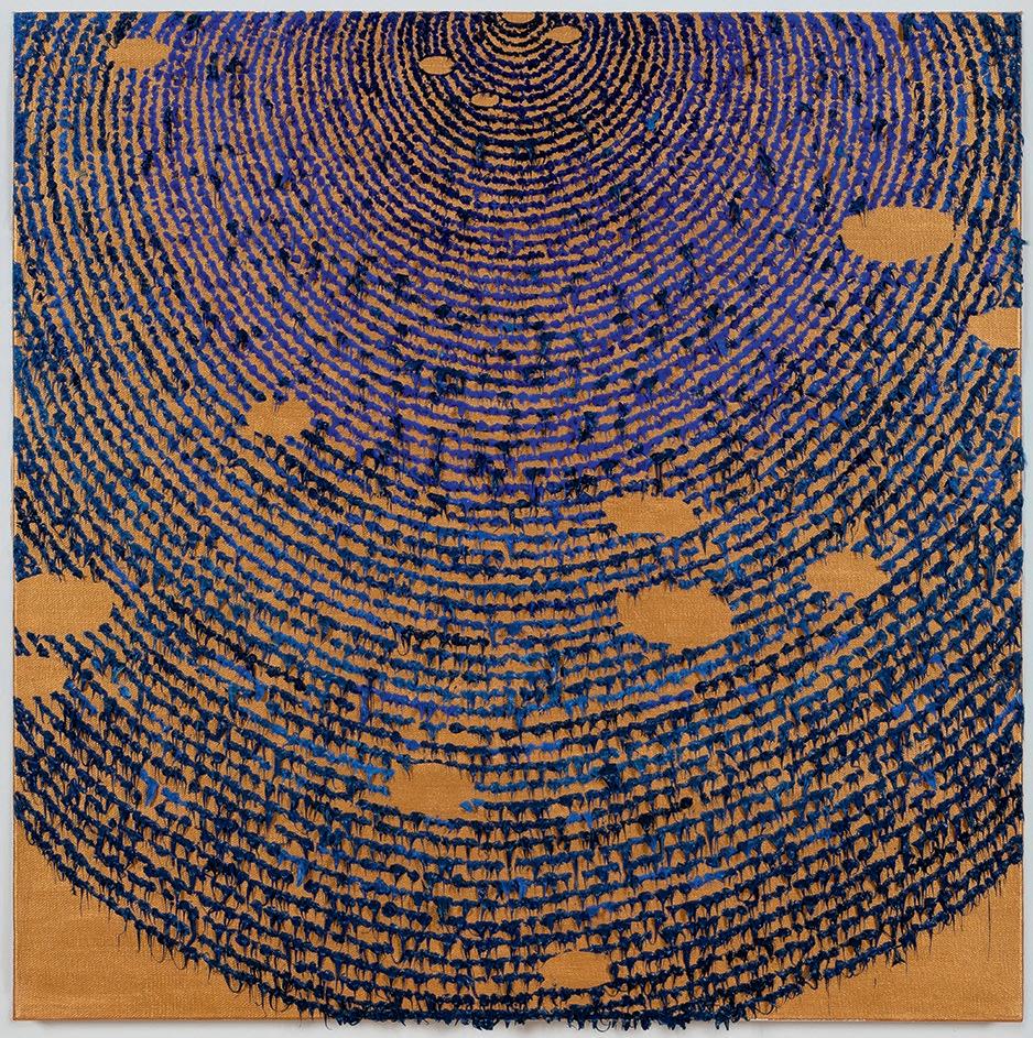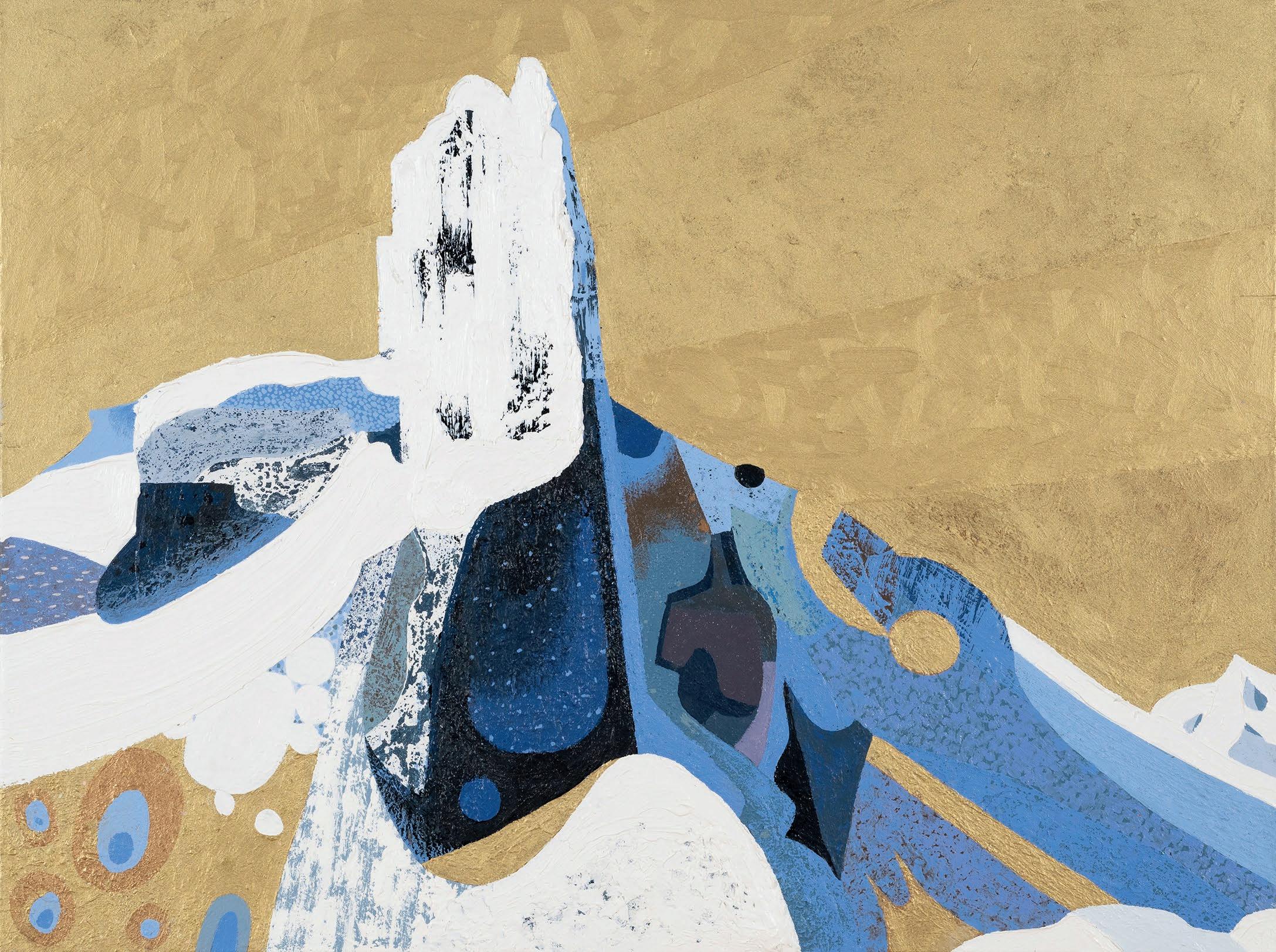 Bernadette Phan (1966 - ) is a Vietnamese-Canadian visual artist based in Vancouver. She received a BFA from Concordia University and an MFA in printmaking from Temple University in Philadelphia. Sky Dripped uses generous applications of pigment that fan out from the top of the canvas, reminiscent of a drop radiating out on a still surface of water. This texture builds on the surface of the canvas where lighter blue tones create depth within the pattern while being backlit by warm golden hues. This piece would make an excellent addition to any collector looking to acquire a serene work that makes a bold statement.